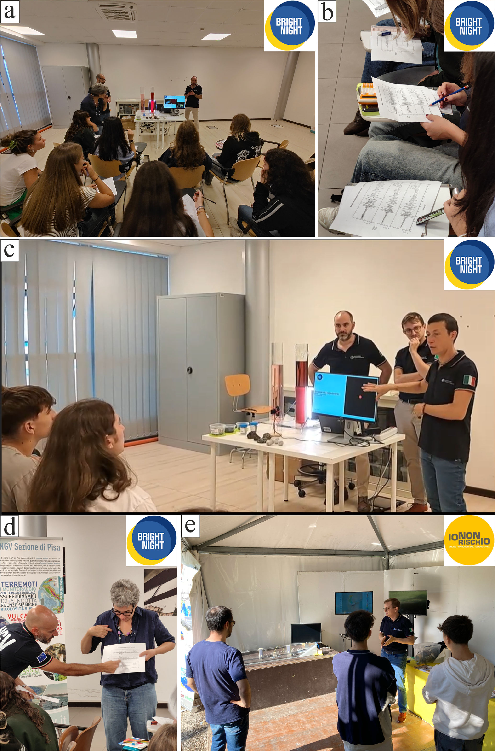 INGV has a long-running experience in disseminating geo-scientific knowledge, demonstrated by multiple dissemination events (see e.g. D'Addezio et al., 2014; Riposati et al., 2020; Cianetti et al., 2021; D'Addezio, 2025). In this work, we report two initiatives within the framework of two national events, the European Researchers' Night – BRIGHT-NIGHT (https://bright-night.it/, last access: 13 October 2025) and the “Io non rischio” campaign (https://iononrischio.protezionecivile.it/en/know/campaign-manifesto/, last access: 13 October 2025).