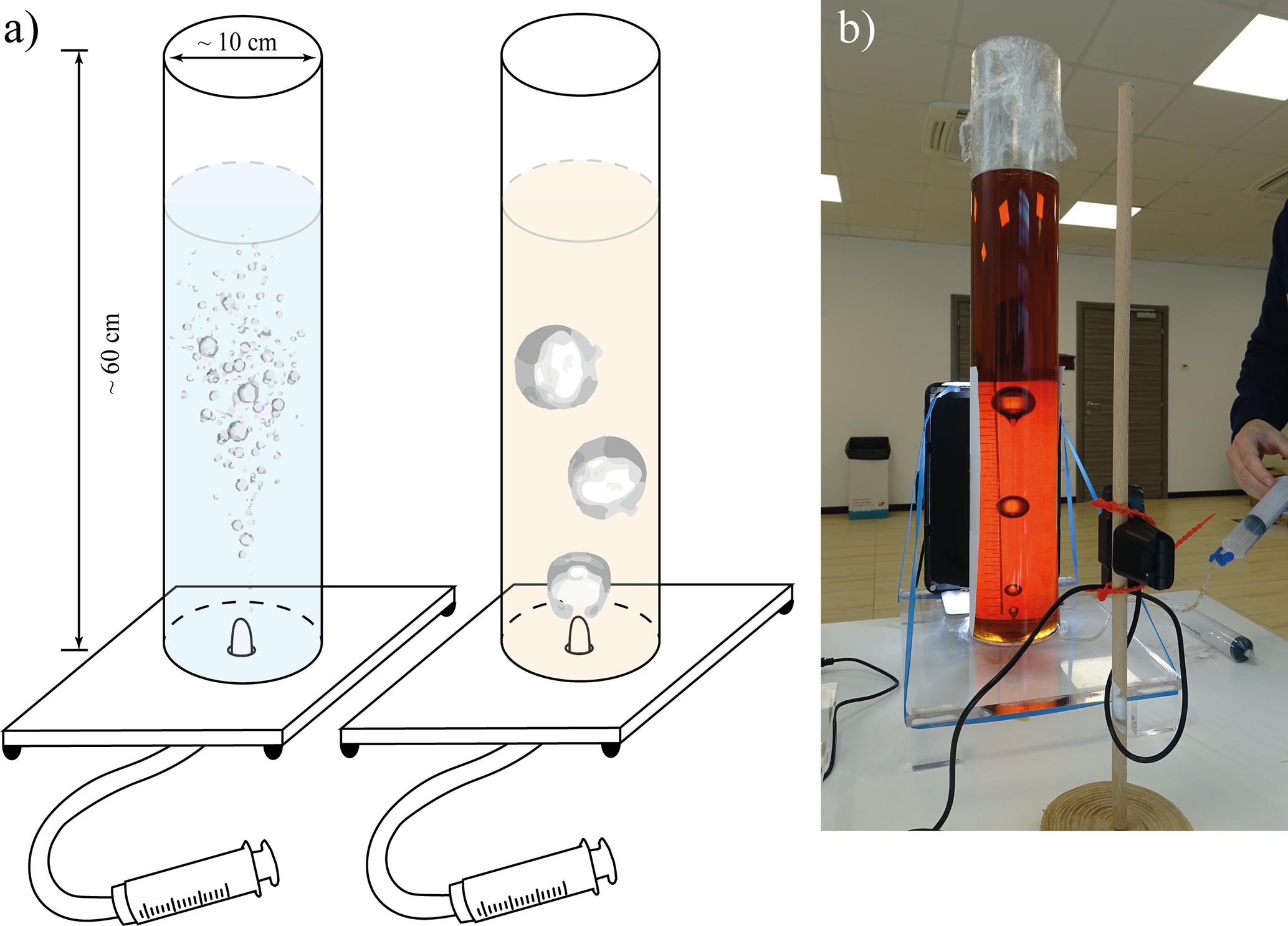 Figure 2(a) scheme of the bubble apparatus for both the water- and golden syrup-filled cylinders; (b) a picture of the bubble experiment showing the bubble rise. Bubble size is not due to decompression, but rather to differences in the initially injected volume.