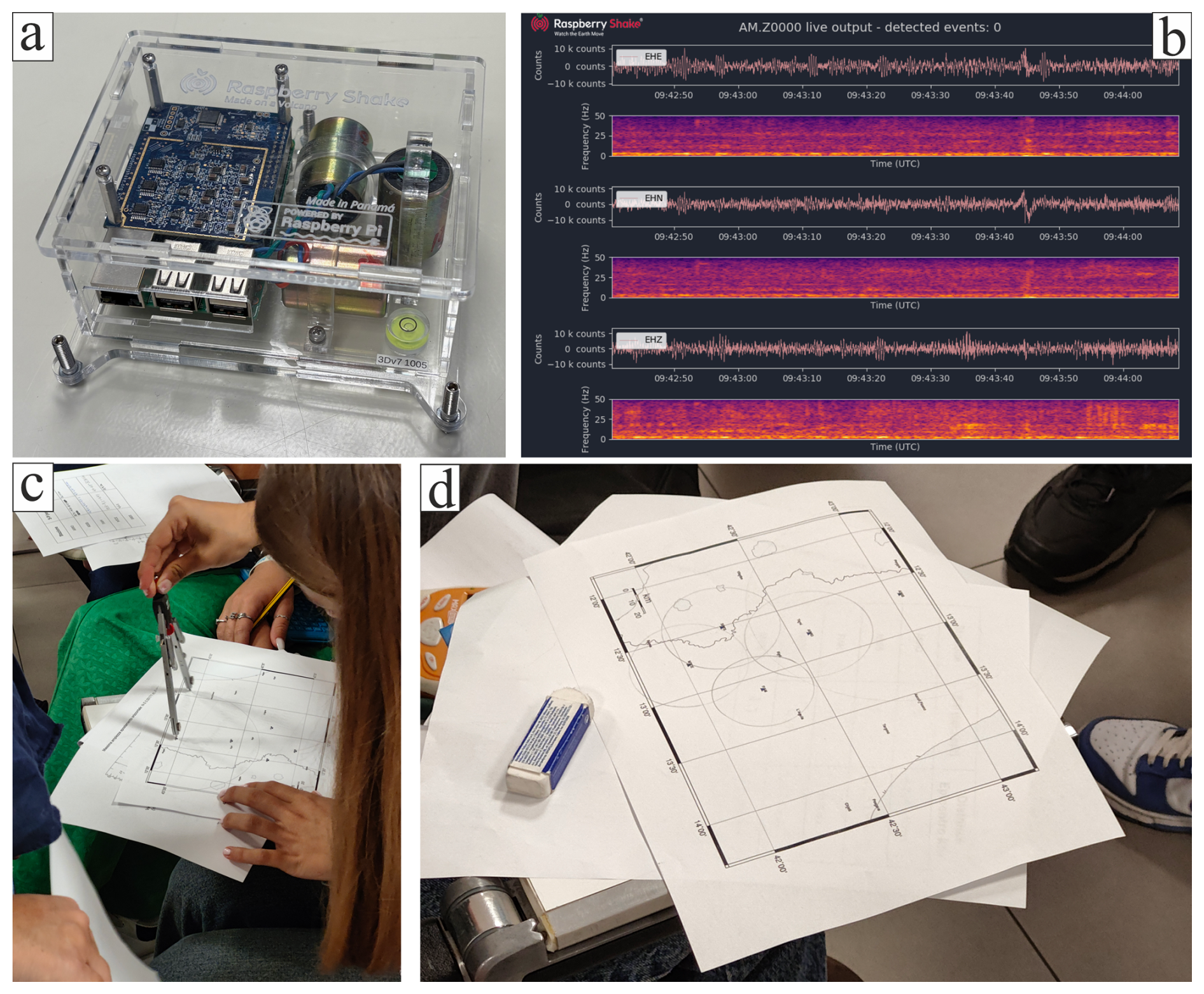 Figure 4(a) Raspberry Shake RS3D seismometer; (b) plot of waveforms and the frequency spectra for the three components on the right; (c–d) pictures of the exercise to determine the location and magnitude of an earthquake.