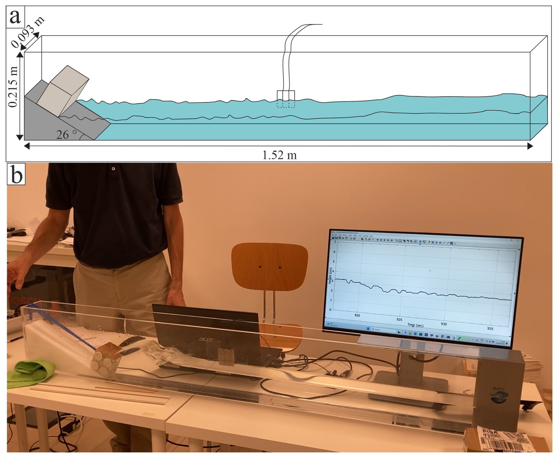 Figure 5(a) scheme of the tsunami apparatus showing the rectangular box filled by water, and the different components of the apparatus (inclined plane, rigid block and sensor); (b) picture of tsunami experiment.