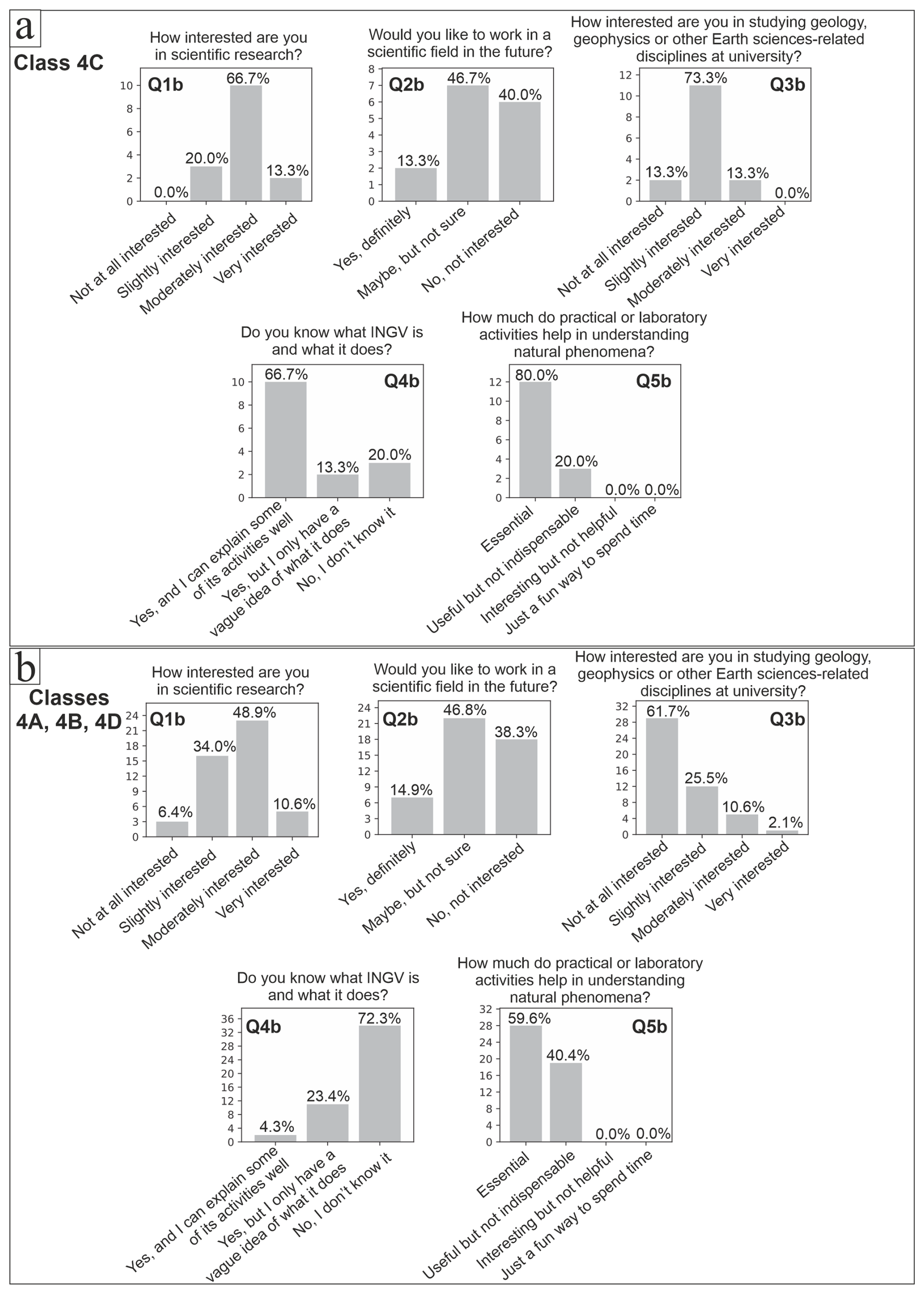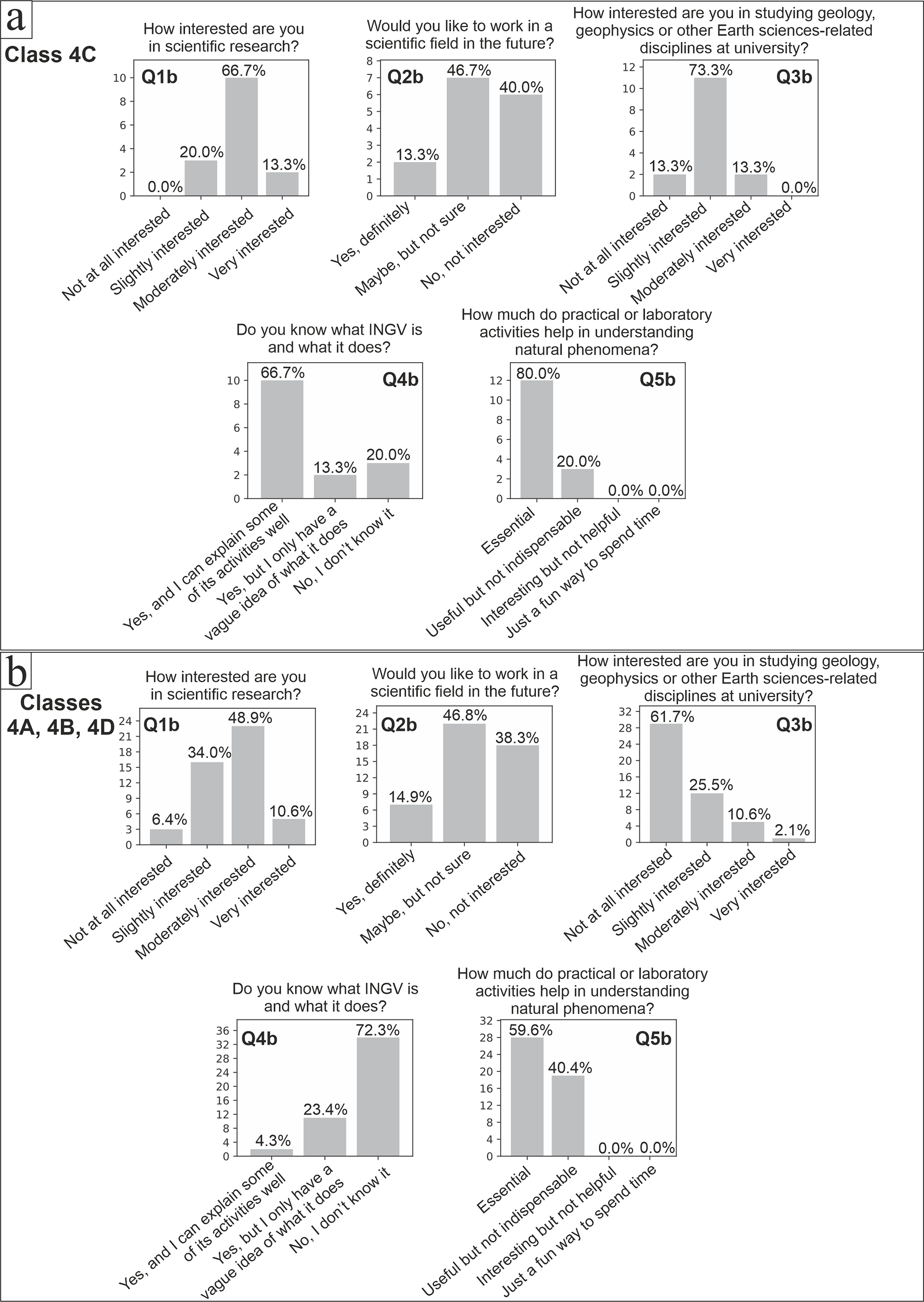 Comparing the answers on general topics from the two groups (Fig. 6), we found that most students reported slight to moderate interest in scientific research: in group 4C, 20 % were slightly interested, ∼ 67 % moderately interested, and ∼ 13% very interested; in groups 4A–4B–4D, 34 % were slightly interested, ∼ 49 % moderately interested, and ∼ 11 % very interested (Q1b). Also, when asked about their interest in pursuing a scientific career, the two groups provided analogous answers: ∼ 40 % of students expressed no interest, and ∼ 47 % responded with “maybe” (Q2b). The percentage changed when students were asked if they could be interested in studying Earth Science or geophysical disciplines: while ∼ 62 % of students in classes 4A–4B–4D stated that they were not at all interested, ∼ 73 % of the students from class 4C reported being slightly interested (Q3b). As expected, INGV as a public research institute was much better known among class 4C respondents, with ∼ 67 % being able to explain the institute in detail compared to only ∼ 4 % in the other groups (Q4b). An important aspect is related to Q5b, which investigated the importance of practical activities. Interestingly, 80 % of the students in class 4C believe that practical or laboratory activities are essential for understanding natural phenomena, while only ∼ 60 % of the students who did not attend the lesson shared this view, emphasising the effectiveness of our approach.