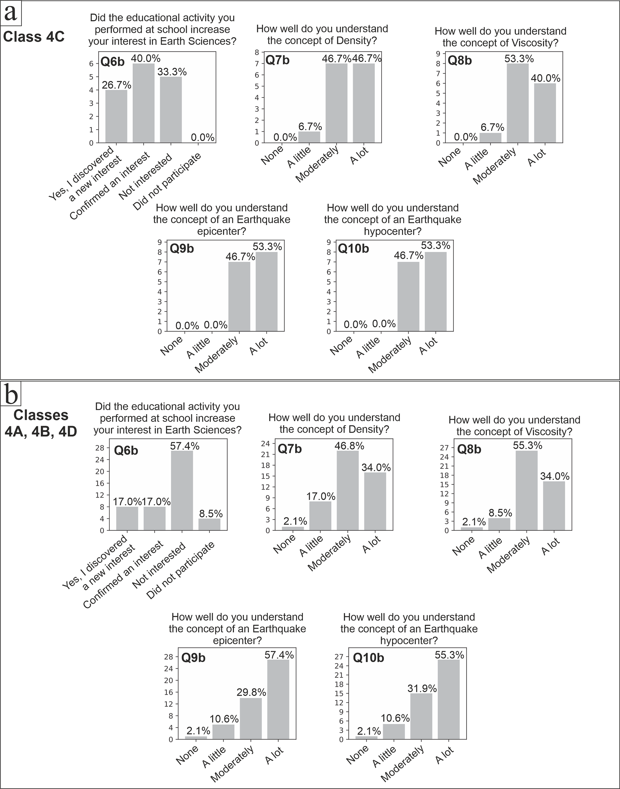 At the end of the lesson, the students were asked to complete a questionnaire designed to evaluate both the effectiveness of the conveyed messages and their understanding of Earth and physical processes. The questionnaire was administered not only to the class that participated in the experiments (class 4C) but also to three other classes (4A, 4B and 4D), of the same age and from the same school, which did not attend the lesson. This allowed us to evaluate the perception of the two audience groups with respect to the same type of information. All classes had previously attended in-person lessons at their institution on the topics related to the experiments, which provided them with a common background.