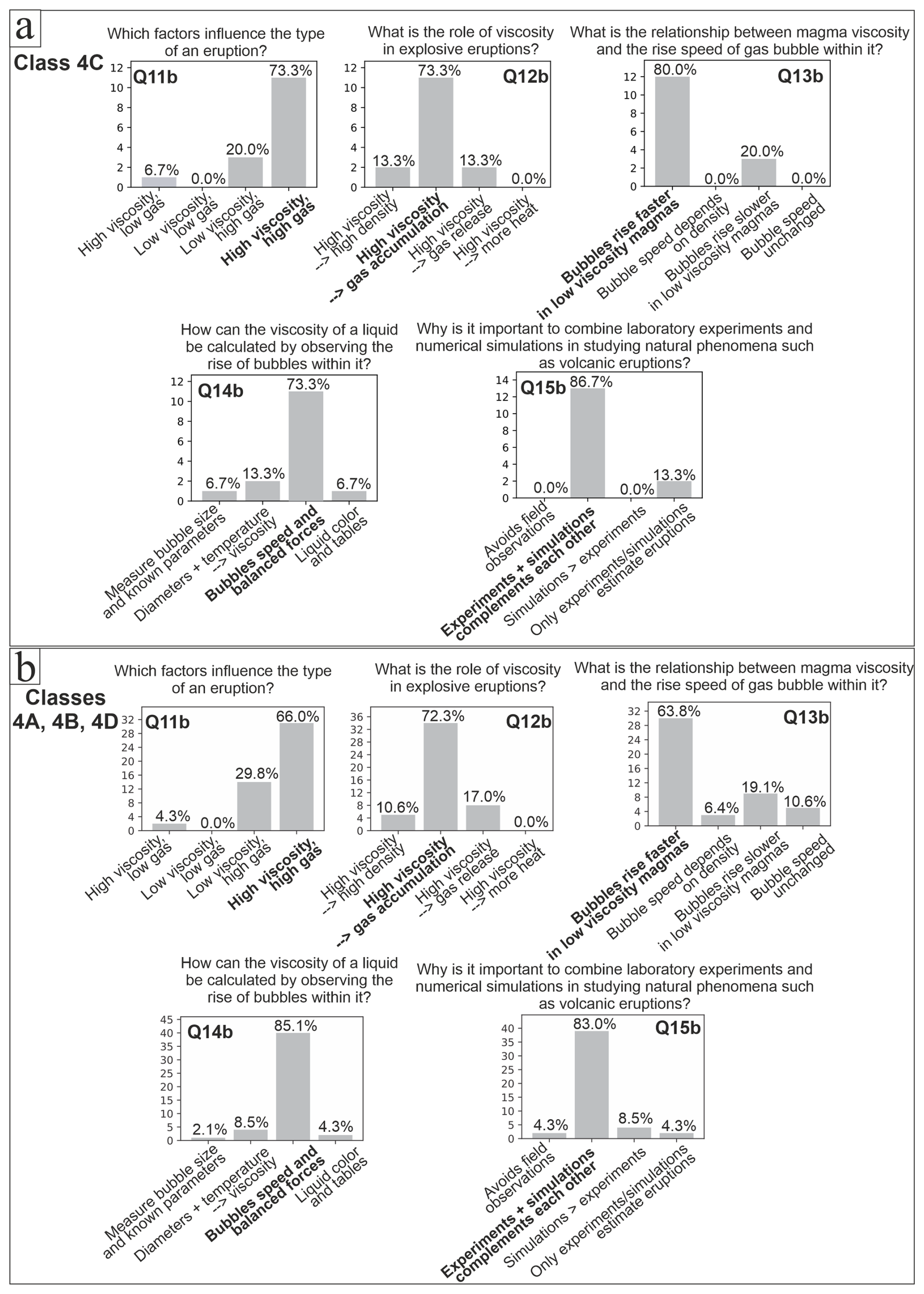 Figure 8Results questionnaire for specific questions Q11b–Q15b for (a) the class who participated in the lesson (4C) and (b) the classes who did not participate in the lesson (4A–4B–4D). Correct answers are highlighted in bold.