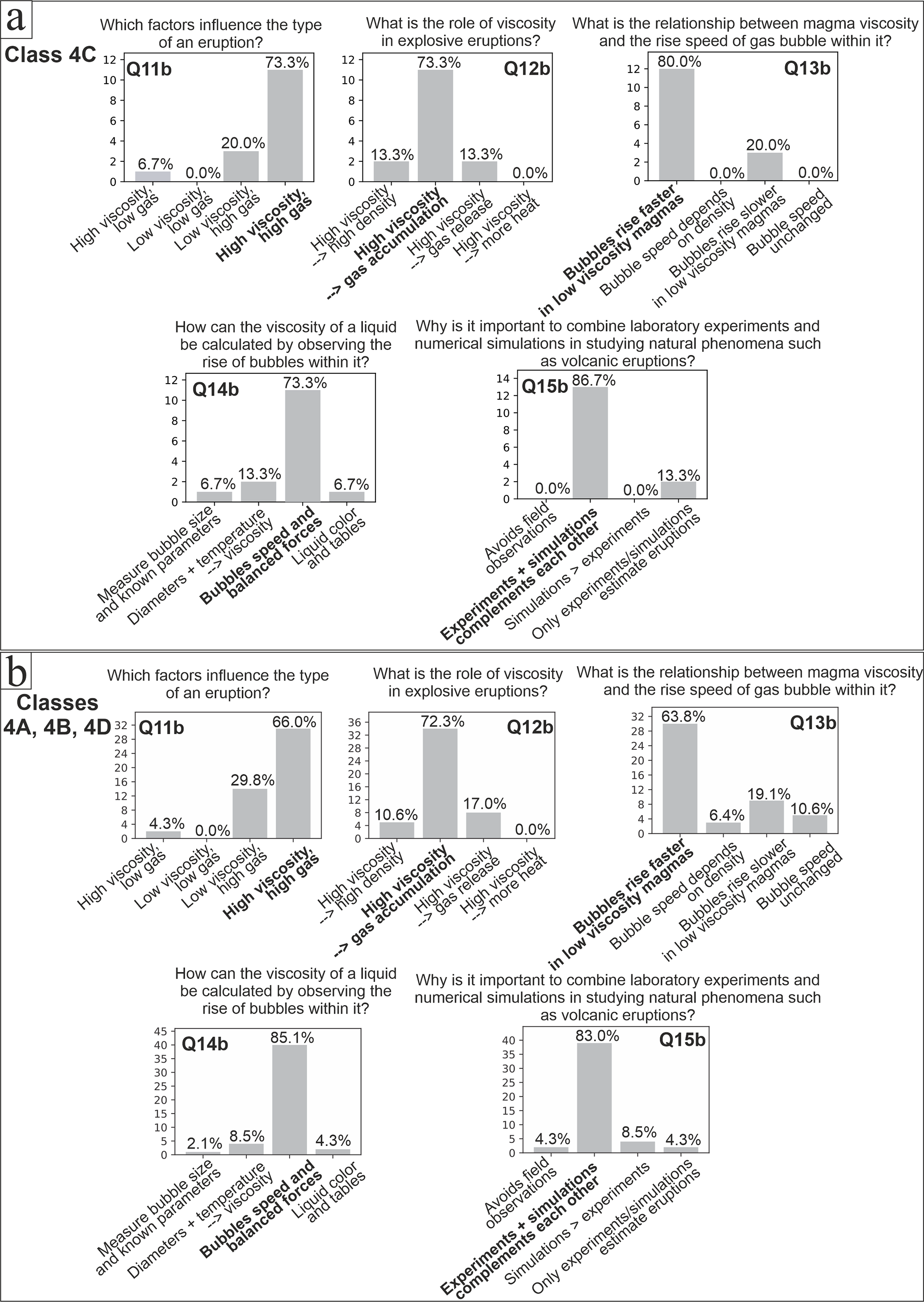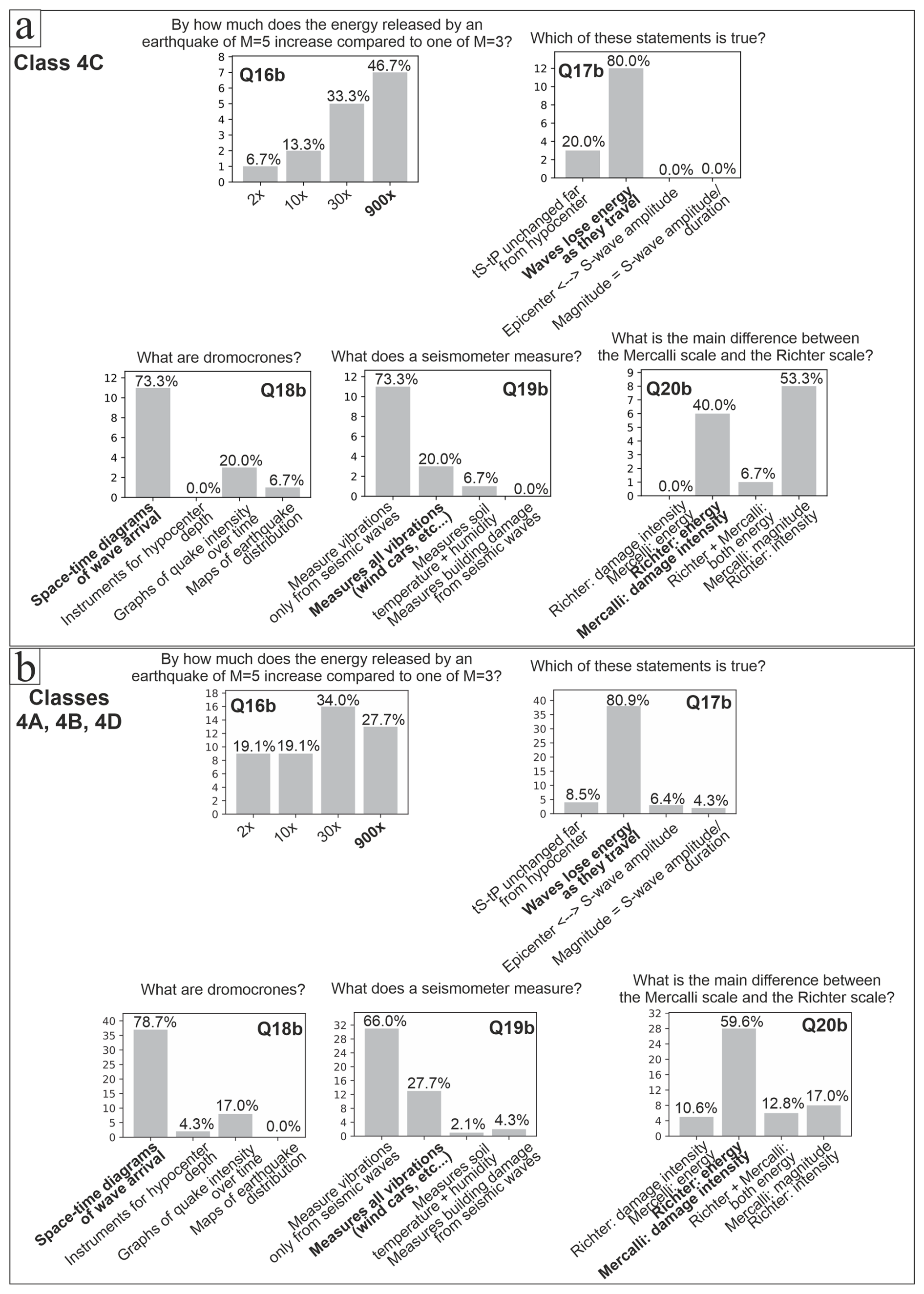 Overall, the responses to the specific questions (Figs. 8–9) indicate that participation in the initiative led to an increase in knowledge on certain topics. Concerning the volcanology-related questions (Q11b–Q15b), the students in class 4C performed better on questions Q11b–Q12b–Q13b–Q15b. Approximately 73 % of these students answered correctly to the question “Which factors influence the type of an eruption?” (Q11b), in comparison to ∼ 66 % of students from the other classes, while both groups achieved similar success on the question “What is the role of viscosity in explosive eruptions?” (Q12b) with ∼ 73 % correct responses. For Q13b (relationship between magma viscosity and rising speed of gas), ∼ 80 % of class 4C answered correctly, versus ∼ 64 % in classes 4A-B-D, and for Q15b (importance of combining numerical and laboratory experiments), ∼ 87 % of class 4C responded correctly compared to ∼ 83 % in the other groups. However, Q14b (calculation of the viscosity of a liquid) was answered more accurately by students from classes 4A-B-D (∼ 85 % correct) than by those from class 4C (∼ 73% correct). Regarding seismological-related questions (Q16b–Q20b), the data reveal some interesting trends. For Q16b (earthquake magnitude increase from M3 to M5), students in class 4C performed better with ∼ 47 % correct answers compared to ∼ 28 % in the other groups, whereas for Q17b (find the correct answer about seismic waves) and Q18b (“What are dromocrones?”) both groups obtained similar results, with correct responses rates of ∼ 80 % on each question. Q19b (“What does a seismometer measures?”), however, was a challenge for both groups, with only ∼ 20 % of class 4C and ∼ 28 % of classes 4A-B-D answering correctly. Finally, for Q20b (differences between Mercalli scale and Richter scale), students from classes 4A-B-D provided a higher percentage of correct answers (∼ 60 %) than those from class 4C (∼ 40 %).