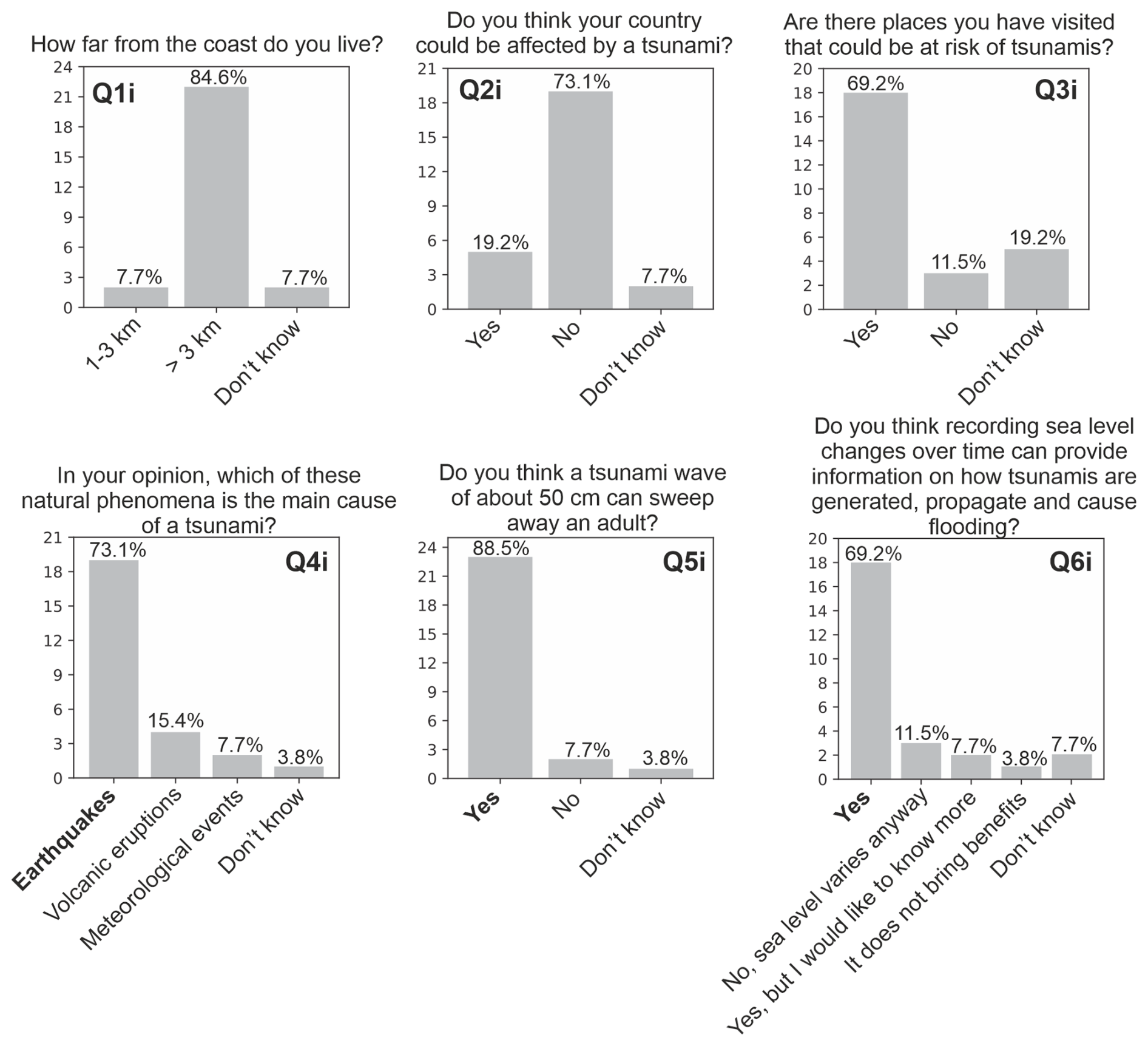 Figure 10Results of the pre-experiment questionnaire for the tsunami experiment. Correct answers (Q4i–Q6i) are highlighted in bold.