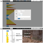 Figure 1(a) Interface of “Sedimentary Rock!”. A columnar section is created and edited by entering a single layer's thickness and grain size. (b) Musification from the Pleistocene tidal deposits. A columnar section on the left was created on Sedimentary Rock!, and another was modified from Kitazawa and Tateishi (2005).