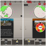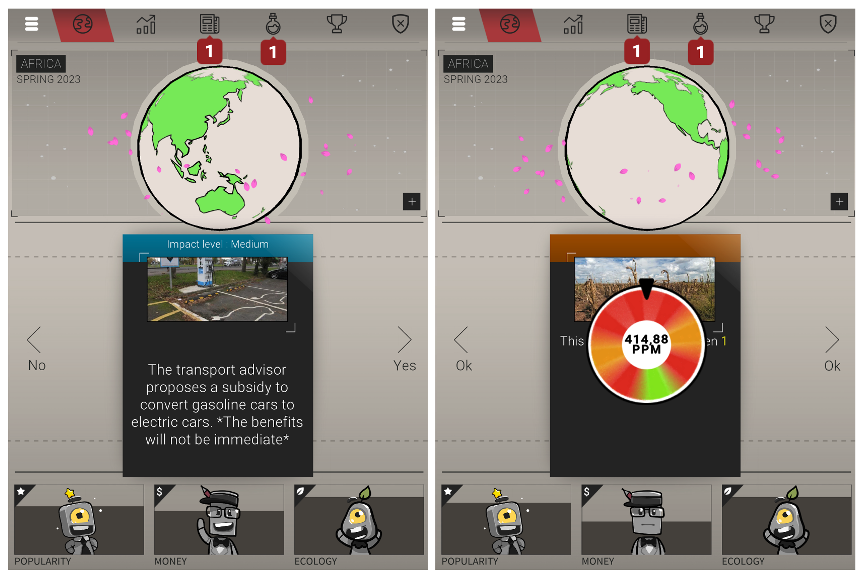 Figure 1Screenshots from ClimarisQ illustrating core gameplay elements. The left panel shows a policy decision proposed by an advisor, whose acceptance or rejection affects three parameters – ecology, money, and popularity. The right panel displays the current atmospheric CO2 concentration, which modulates the frequency of extreme weather events, linking cumulative emissions to climate risk within the game.