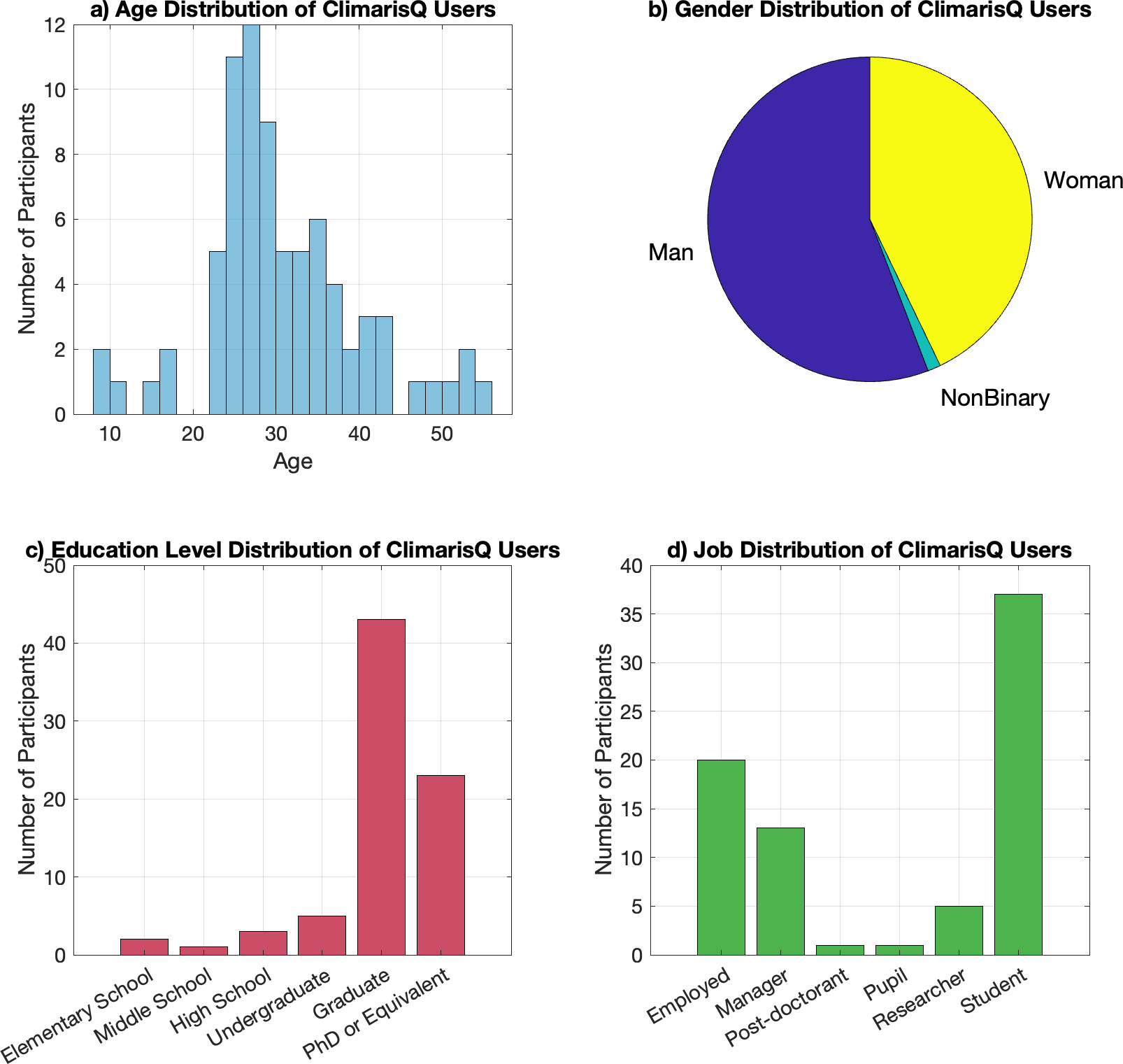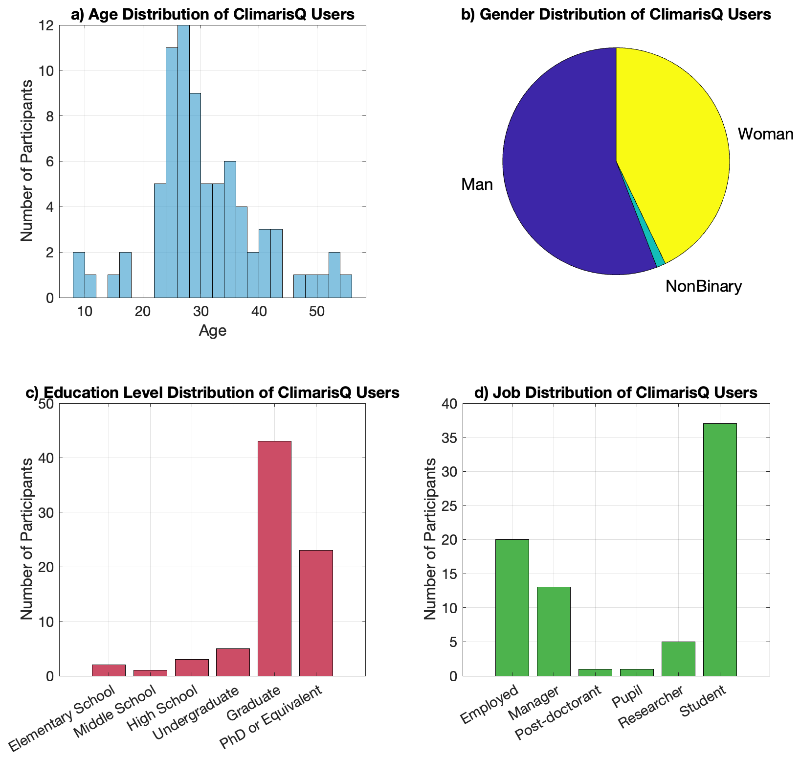 Figure 2Demographic distribution of ClimarisQ users. (a) Age distribution of participants, showing the most common age range around 25–35 years. (b) Gender distribution, with the majority identifying as male, followed by female and non-binary participants. (c) Education level distribution, with a portion of users holding graduate or equivalent qualifications. (d) Job distribution, indicating that most participants are students, with a smaller representation from researchers, employed individuals, and other categories. These distributions provide insight into the profile of the game's user base.