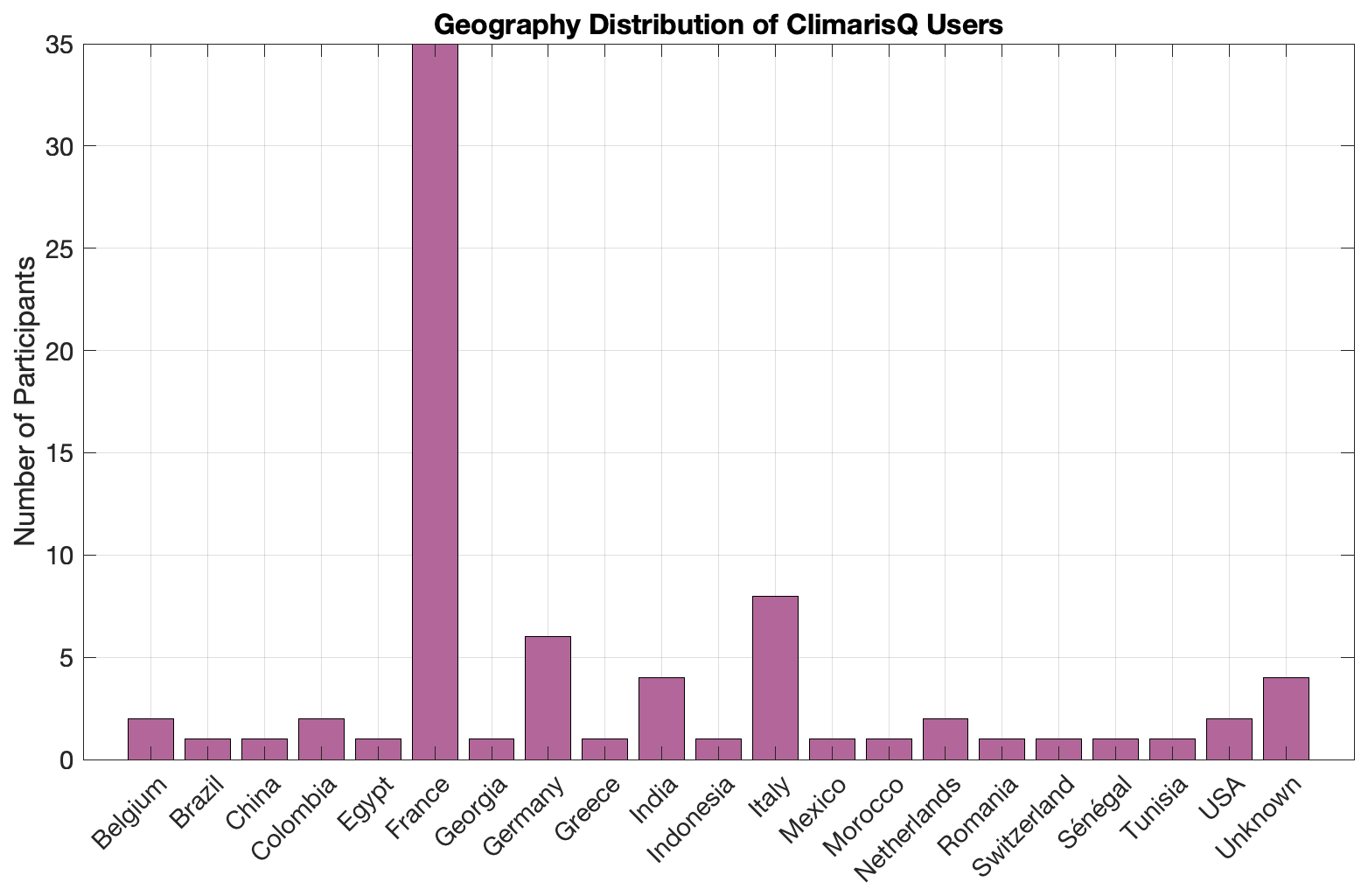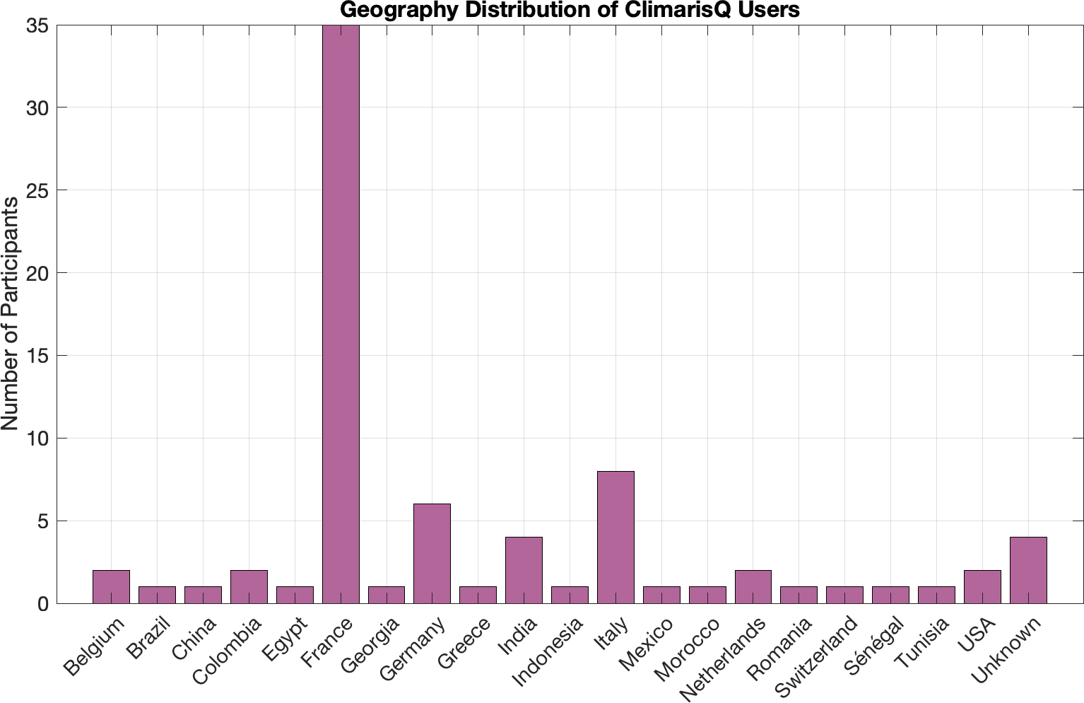 Respondents were generally highly educated, with many indicating graduate-level training (Master's or PhD or equivalent). Participants were geographically diverse, spanning multiple continents (Fig. 3). Countries reported included France and other European countries (e.g. Germany, Italy, Romania, the Netherlands, Belgium), as well as the USA, India, China, Tunisia, Mexico, Brazil, and Egypt, among others. Discovery of the game was most commonly reported through academic or professional networks and online climate-related communities, with additional mentions of social media, workshops or events, and project-related communication (including XAIDA). Fewer respondents reported discovering the game through App store browsing or formal school-based channels.