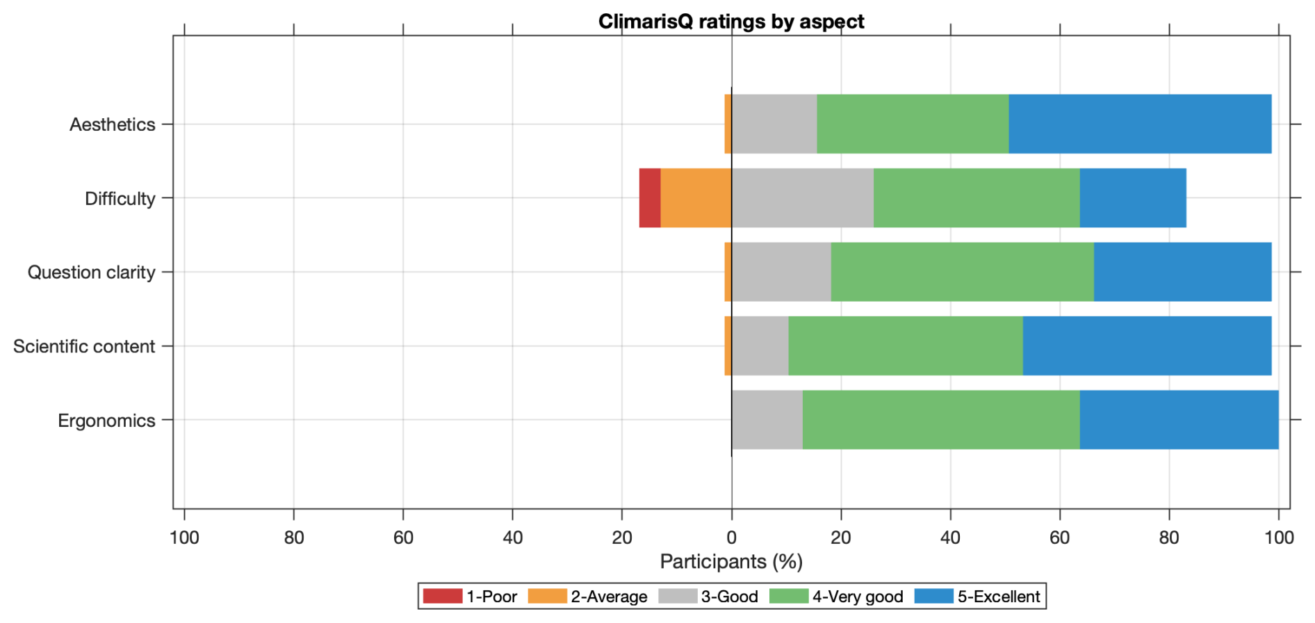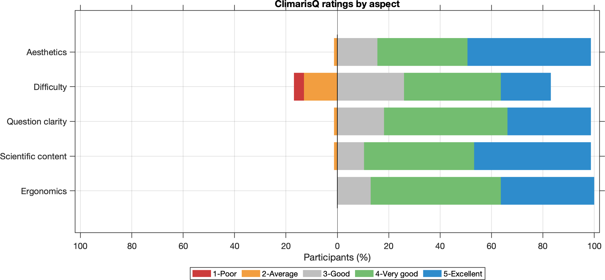 Figure 4Distribution of participant ratings for ClimarisQ game aspects shown as a diverging Likert plot. Ratings are reported on a five-point Likert scale ranging from 1 (Poor) to 5 (Excellent) for Ergonomics, Scientific Content, Question Clarity, Difficulty, and Aesthetics. Negative and positive responses are displayed on opposite sides of the central axis, with the neutral category centered.