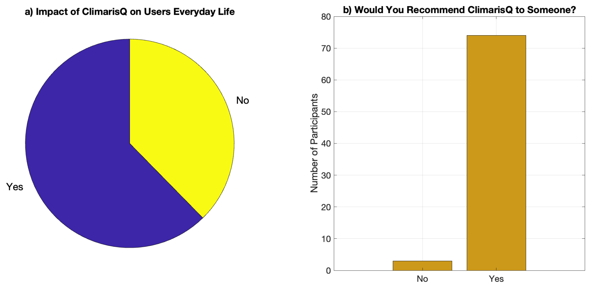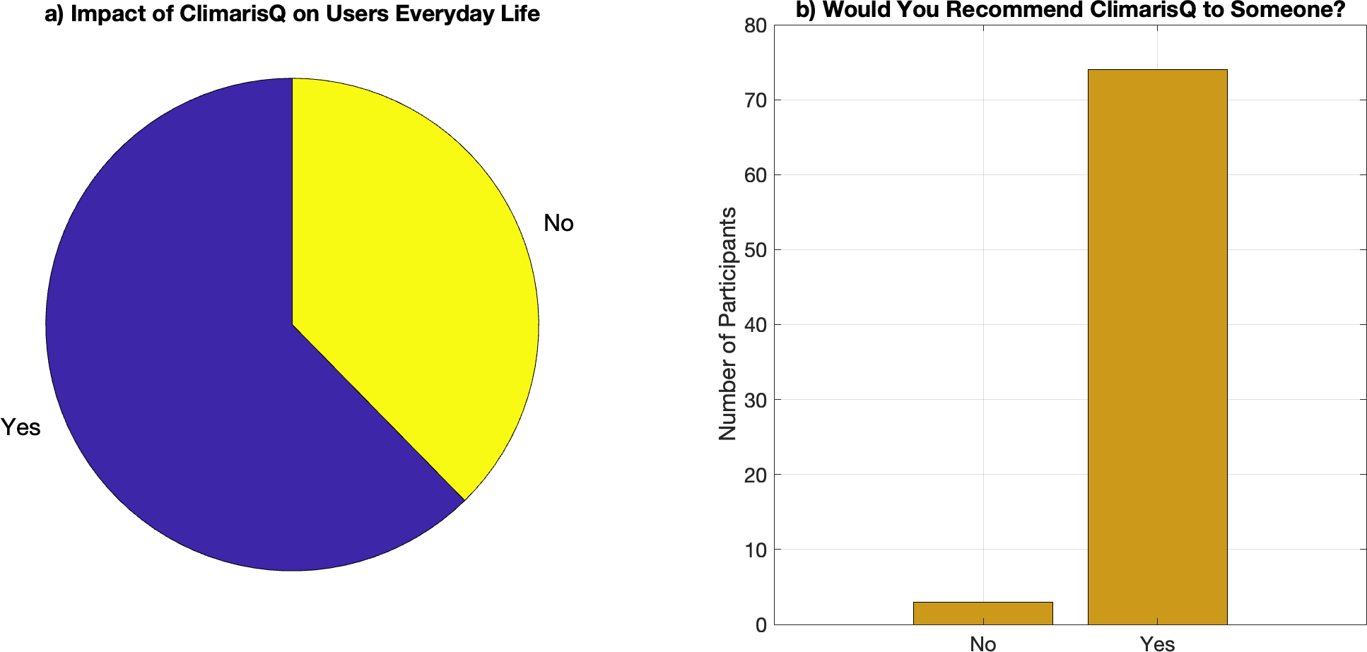 Figure 5User responses to the Impact and Recommendation questions in ClimarisQ. (a) The pie chart illustrates the impact of ClimarisQ on users' everyday lives, with the majority of participants reporting a positive influence (Yes) and a smaller portion indicating no impact (No). (b) The bar chart shows that a vast majority of participants would recommend ClimarisQ to others, with only a few indicating otherwise.