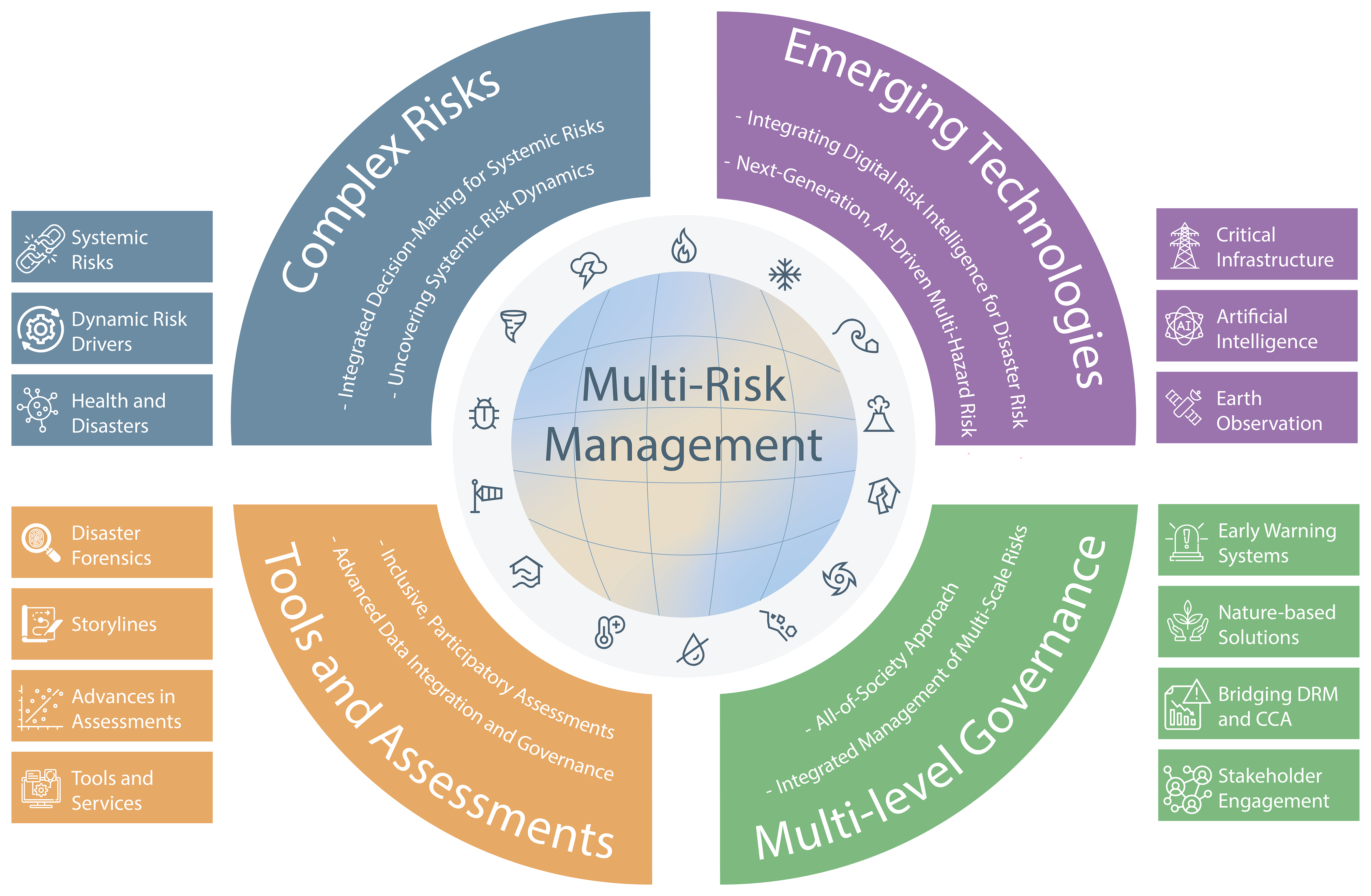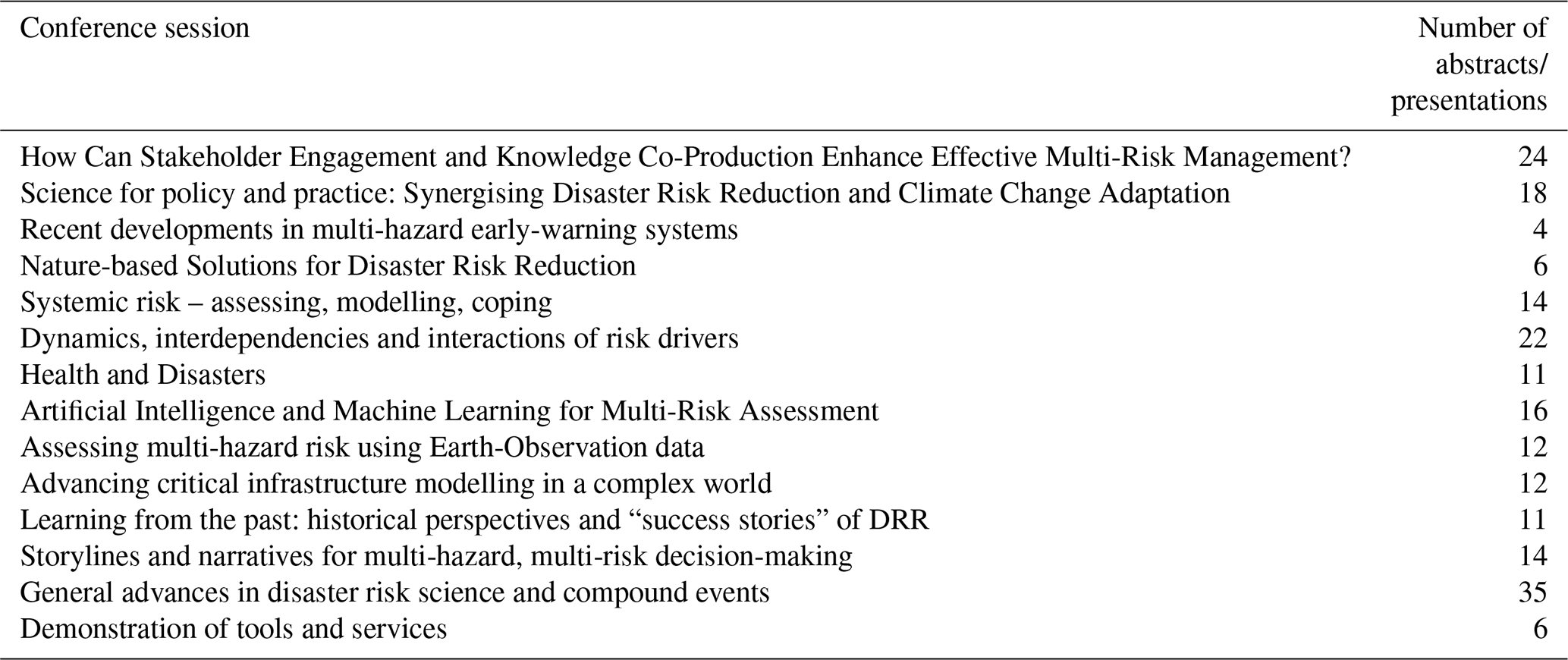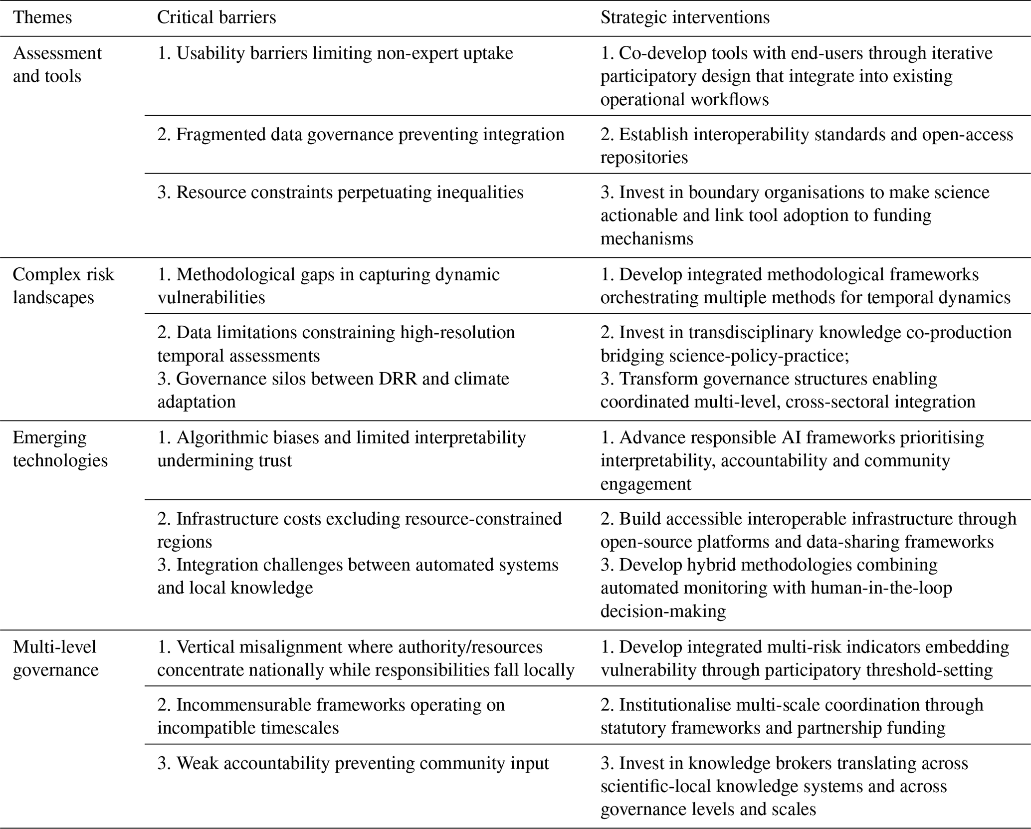 We acknowledge that these thematic categorisations are not mutually exclusive as many sessions contained elements relevant to multiple perspective themes. For example, AI applications discussions in the Emerging Technologies perspective theme may overlap with methodology advances in the Assessments and Tools perspective theme. At the same time, Complex Risks could reasonably intersect with governance challenges addressed in the Multi-level Governance perspective theme. Moreover, the Critical Infrastructure session could equally fit within Complex Risks as its assigned category of Emerging Technologies. This interconnected nature reflects the holistic approach needed to address multi-hazard risks, and the categorisation served as a practical analytical approach rather than a rigid taxonomy. The assignment of sessions to perspectives was conducted by the lead authors and validated through discussion with session conveners during the post-conference consultation process. Drawing from all sources across these interconnected perspectives, we synthesised two main priorities per perspective theme through iterative discussion among the author team.