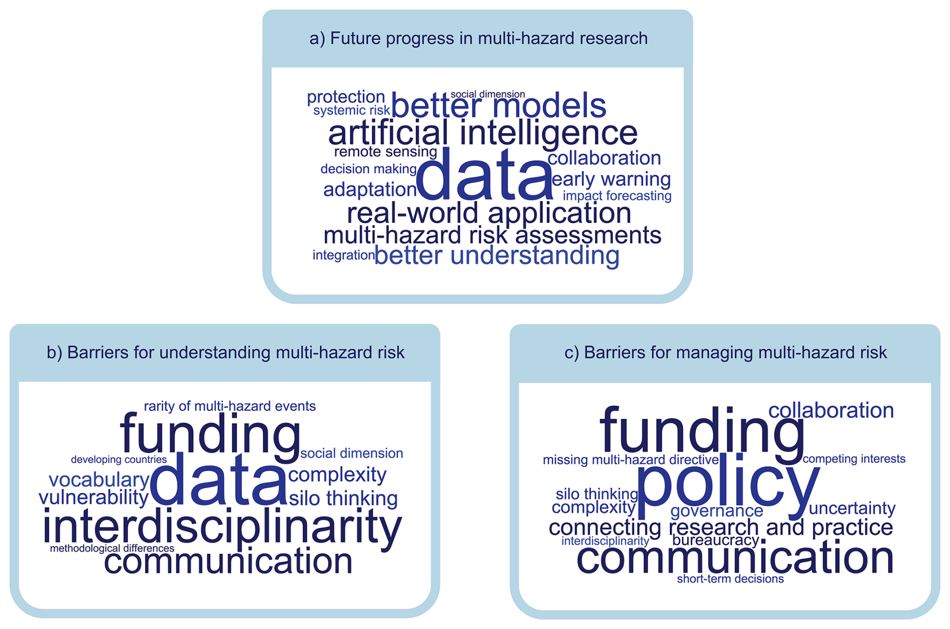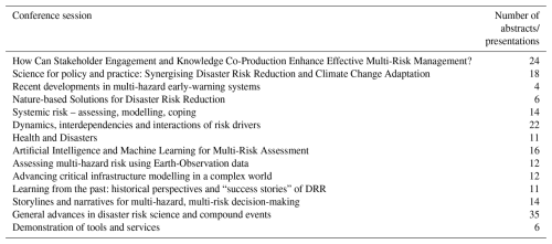 Within the survey, we used the answers to the following questions to directly inform our outlook section (Sect. 4): “What do you think is the biggest impediment to progress in understanding of multi-hazard risks over the next 5 years?” and “What do you think is the biggest impediment to better managing multi-hazard risks over the next 5 years?”. We conducted a qualitative, thematic analysis of these open-ended responses, identifying recurring concerns and grouping them into key categories that informed our recommendations. From the survey responses, thematic patterns emerged around institutional capacity, coordination challenges, and technical limitations. The integration of survey insights with conference discussions and expert consultations provided triangulation of findings across different data sources. The following sections combine these data sources and are bolstered by comparison with recent literature.