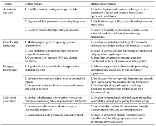 New developments in risk assessment methods and tools, such as improved learning from past events (e.g., retrospective analysis) and the use of storylines, can support an increase in risk awareness and improve risk management capabilities (van den Hurk et al., 2023; Keating et al., 2016; Sillmann et al., 2021; UNDRR, 2024). These tools and assessments demonstrate how complex data can be transformed into actionable insights for better decision-making and proactive risk management (Bastos Moroz and Thieken, 2024; Tools for mainstreaming disaster risk reduction, 2025; Marshall, 2020). However, barriers to their widespread application in multi-risk assessment and DRM remain (Šakić Trogrlić et al., 2024), including technical limitations (model uncertainties, data quality), institutional challenges (fragmented governance, resource constraints), and usability issues (skill gaps, accessibility, differing stakeholder needs, language barriers). Bridging the gap between scientific capabilities and practical application requires improving tool accessibility and co-developing tools with end-users to ensure relevance and legitimacy. We have identified two research avenues (Sect. 3.1.1 and 3.1.2) for how science can contribute to the Sendai Framework and beyond through participatory approaches and advanced analytical tools that enable shared understanding of risk knowledge and actionable decision-making.