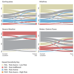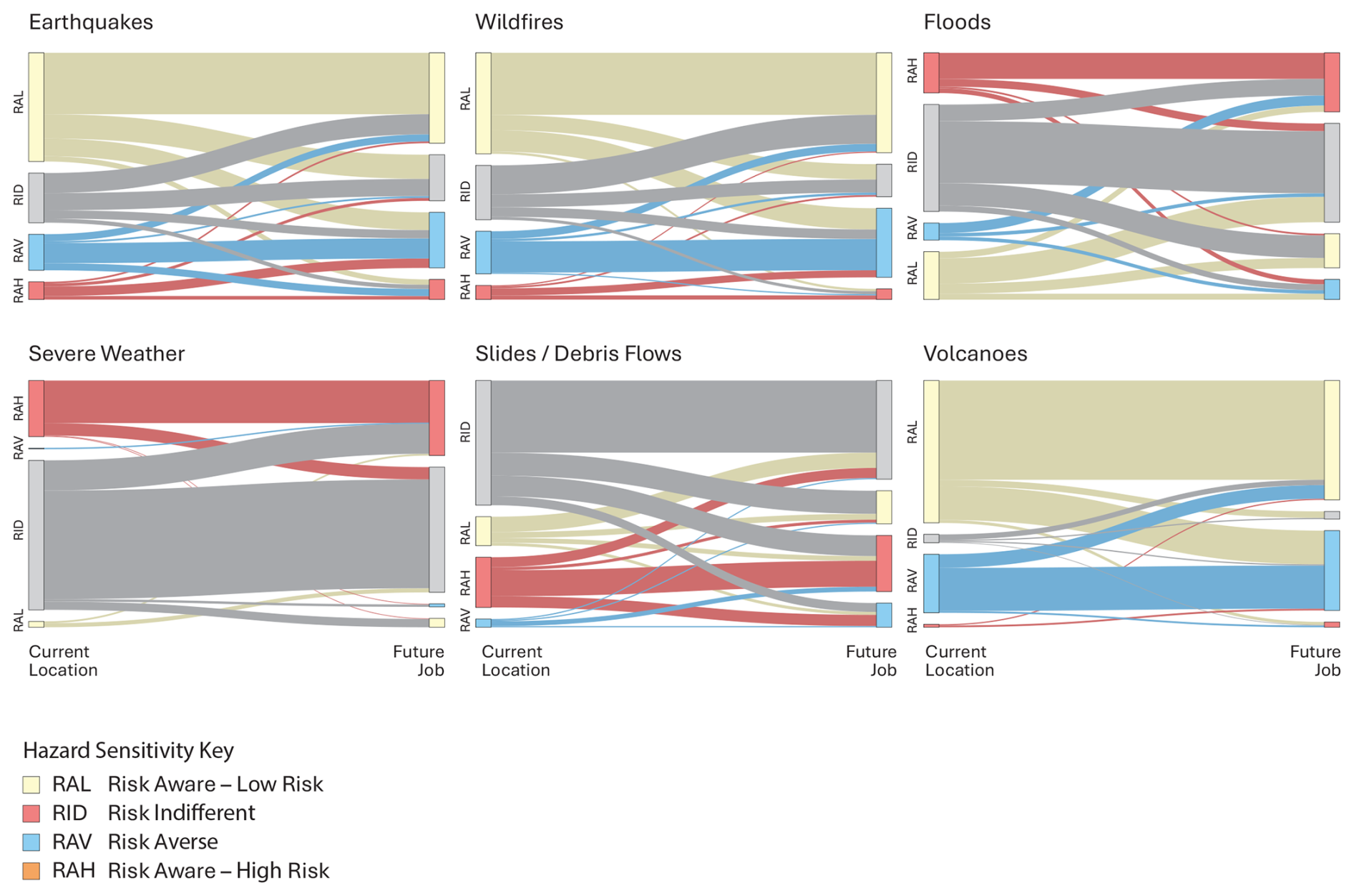Next, we plotted the hazard perception against the actual hazard risk for each location to determine the hazard sensitivity zone of participants. Figure 9 depicts this information for all participants by each specific hazard. For earthquakes and volcanoes, participants showed a decrease in risk aware–low risk (RAL) sensitivity and an increase in risk averse (RAV) sensitivity, indicating that while the hazard risk did not appreciably increase between the current location and future job location, the concern and importance of risk in the decision-making process did. For wildfires and slide hazards, there was a notable increase in risk aversion (RAV) and decline in risk indifference (RID), indicating a shift for some participants from higher to lower hazard risk with a corresponding increase in concern and importance of risk in the final job choice. Floods, severe weather, and slide/debris flow hazards maintained the highest percentage of participants who remained risk indifferent (RID) for both their current and final job locations; albeit the percentage of participants in the risk indifferent (RID) zone declined between the current and final job locations in all cases, with severe weather and slides showing the largest declines. For floods, those in the risk aware–low risk (RAL) zone and the risk indifferent (RID) zone declined, while those in the risk aware–high risk (RAH) zone increased. For severe weather, the decline in those in the risk indifferent (RID) zone was matched with an increase in those in the risk aware–high risk (RAH) zone. This suggests that flood and severe weather hazards may be more acceptable to participants than other hazards, even though these hazards had the highest percentages of participants reporting the most concern and impacts compared to other hazards.