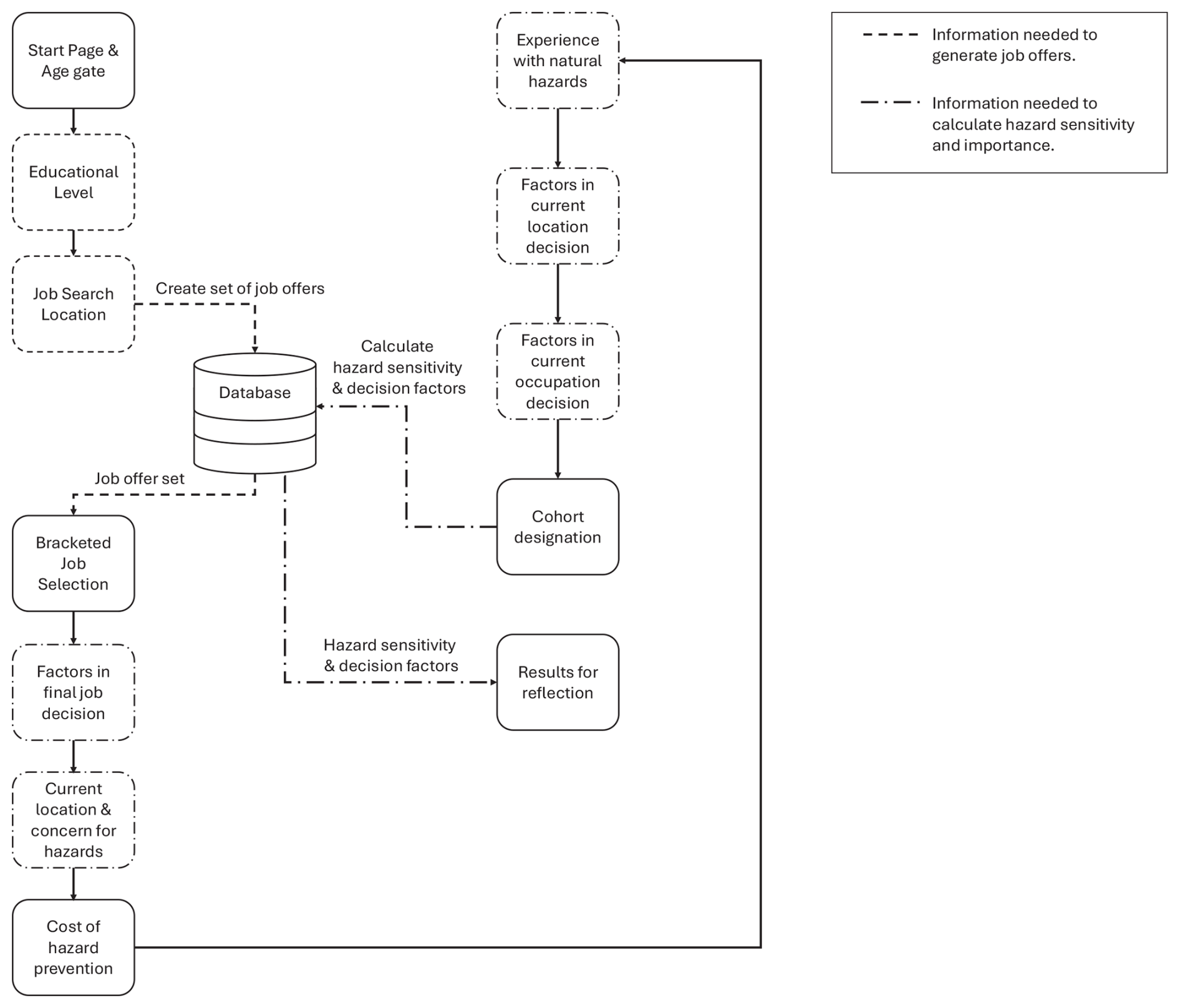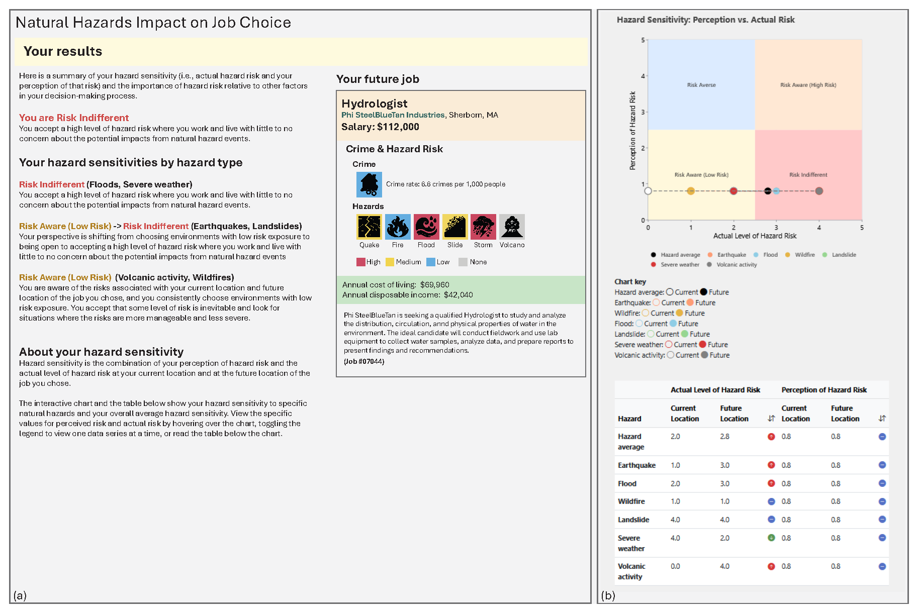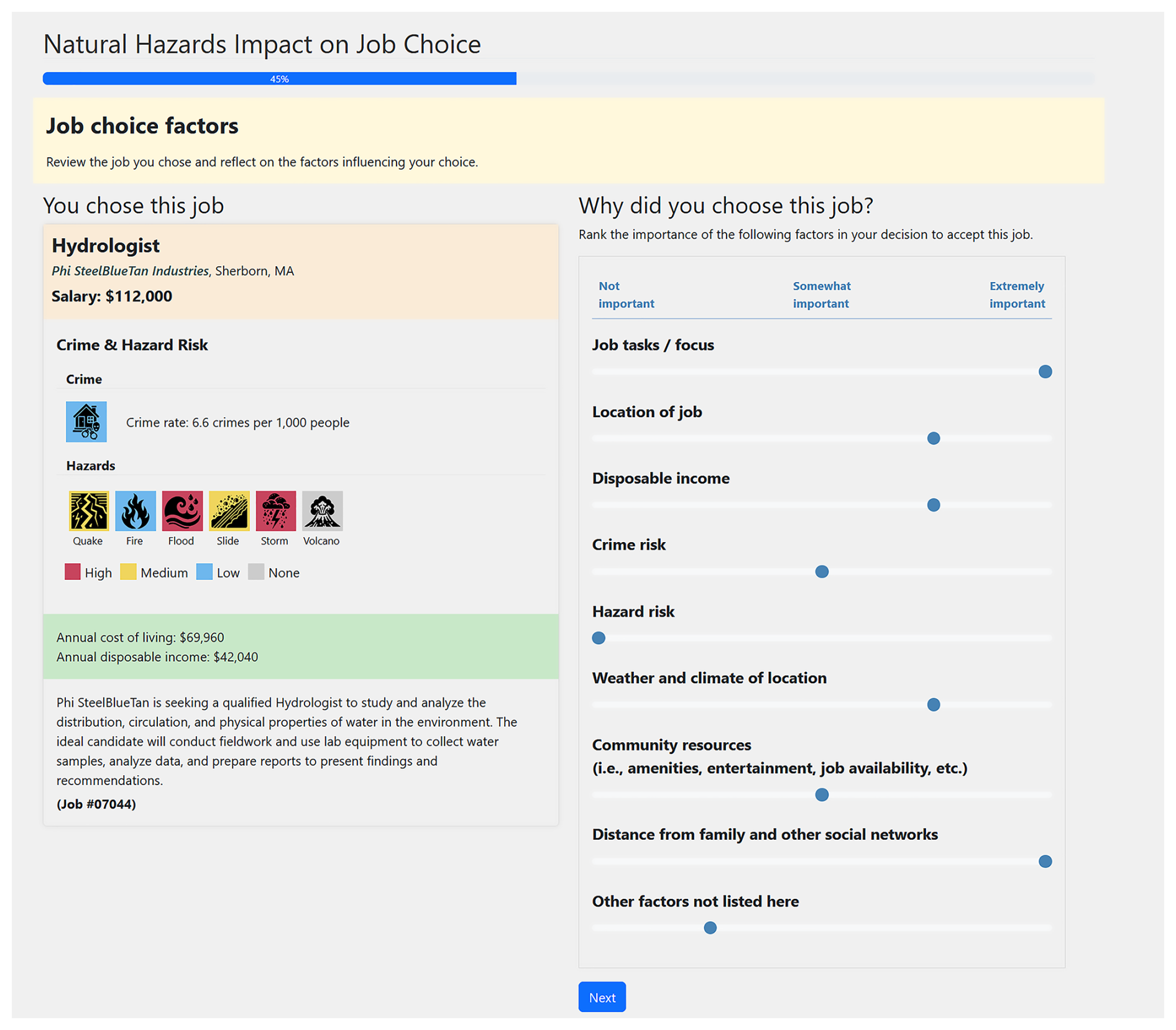 Once the final job choice was made, the participant was guided through a set of reflection questions pertaining to their decision in choosing the job offer, their experience with hazards relative to their current location, and the factors important to the choice of their current location of residence and current occupation. Lastly, the participant was asked to identify the characteristics of their cohort (i.e., career stage, gender, race and ethnicity). The final page of the simulation provided the user with information about their perception of hazard risk, actual hazard risk, and their ranking of hazard risk against other factors in their decision-making process.