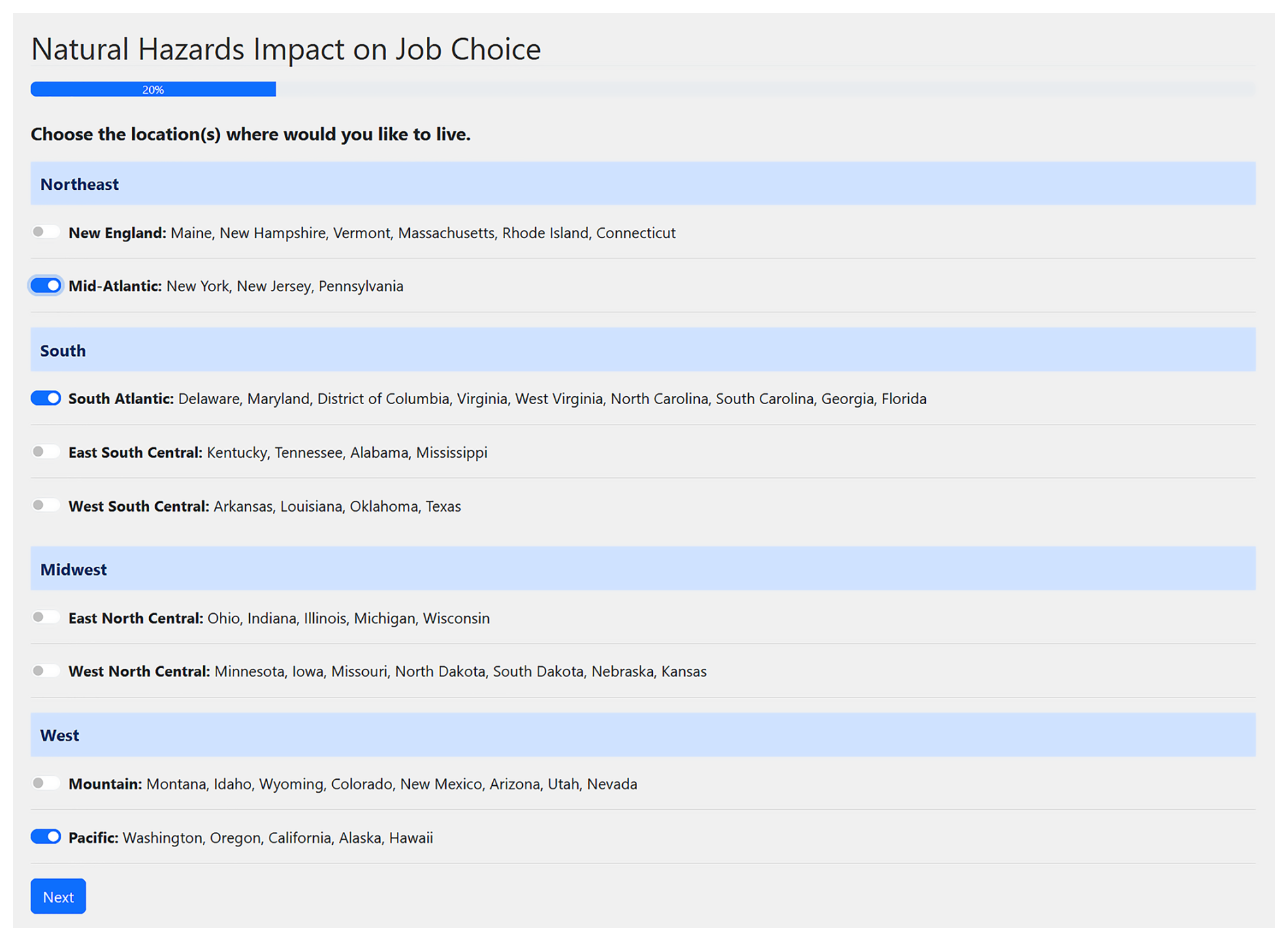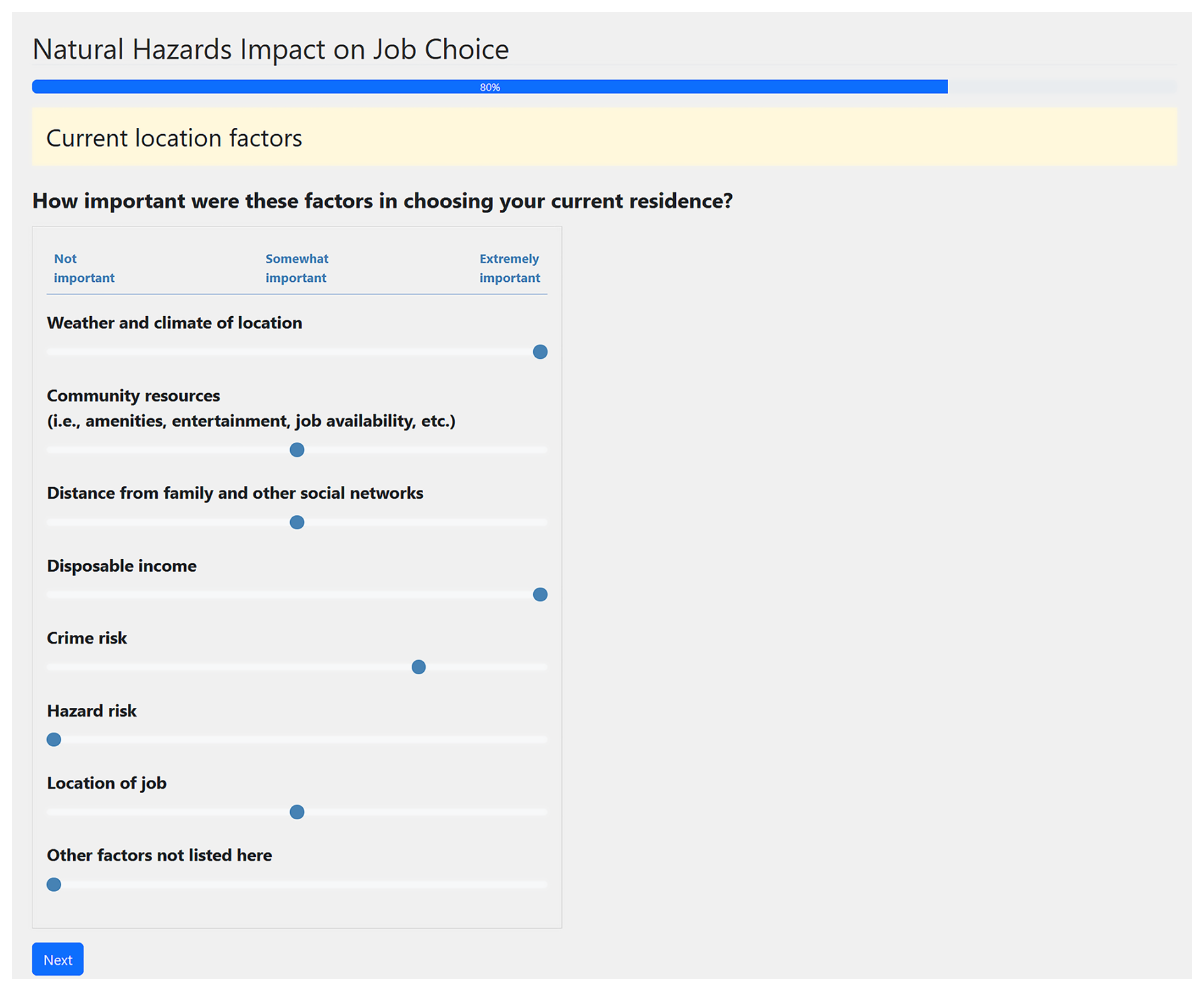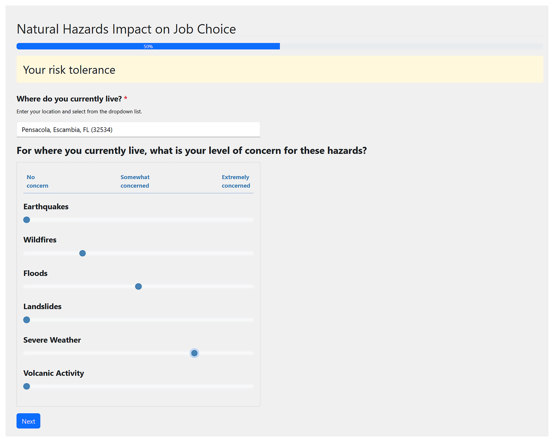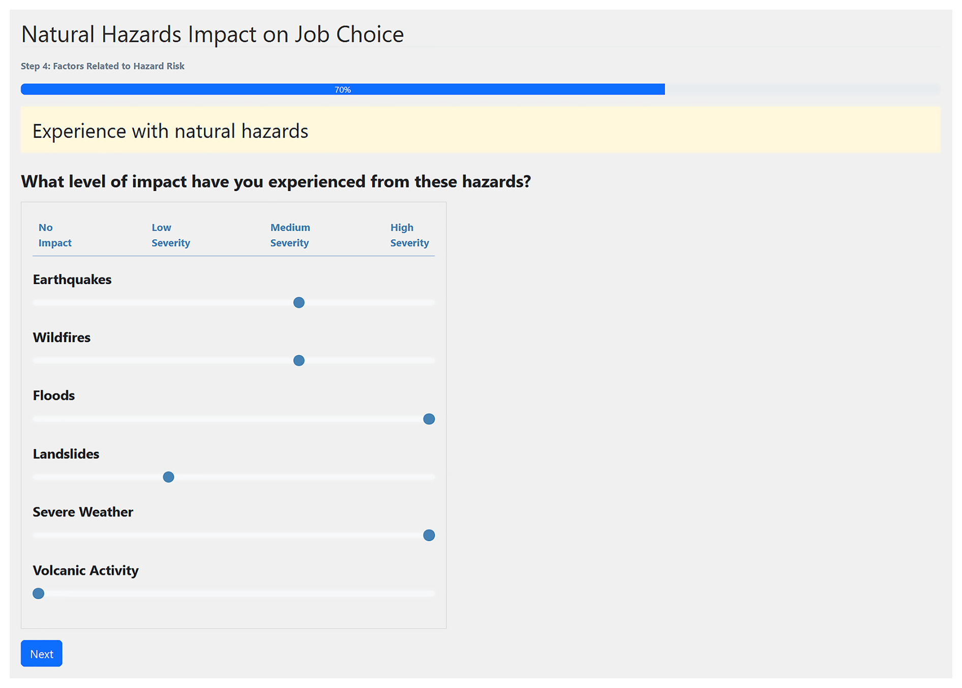 Once the final job choice was made, the participant was guided through a set of reflection questions pertaining to their decision in choosing the job offer, their experience with hazards relative to their current location, and the factors important to the choice of their current location of residence and current occupation. Lastly, the participant was asked to identify the characteristics of their cohort (i.e., career stage, gender, race and ethnicity). The final page of the simulation provided the user with information about their perception of hazard risk, actual hazard risk, and their ranking of hazard risk against other factors in their decision-making process.