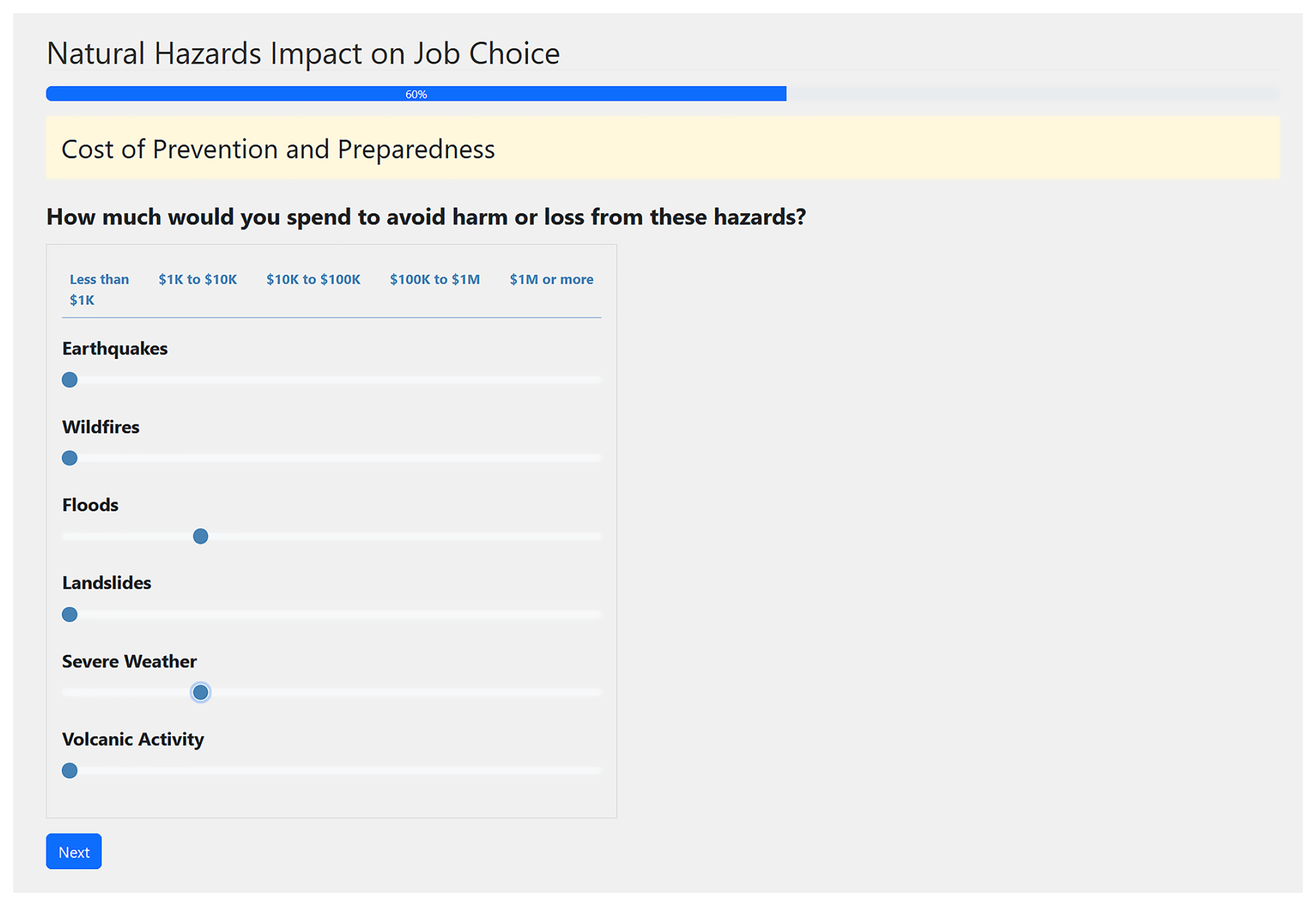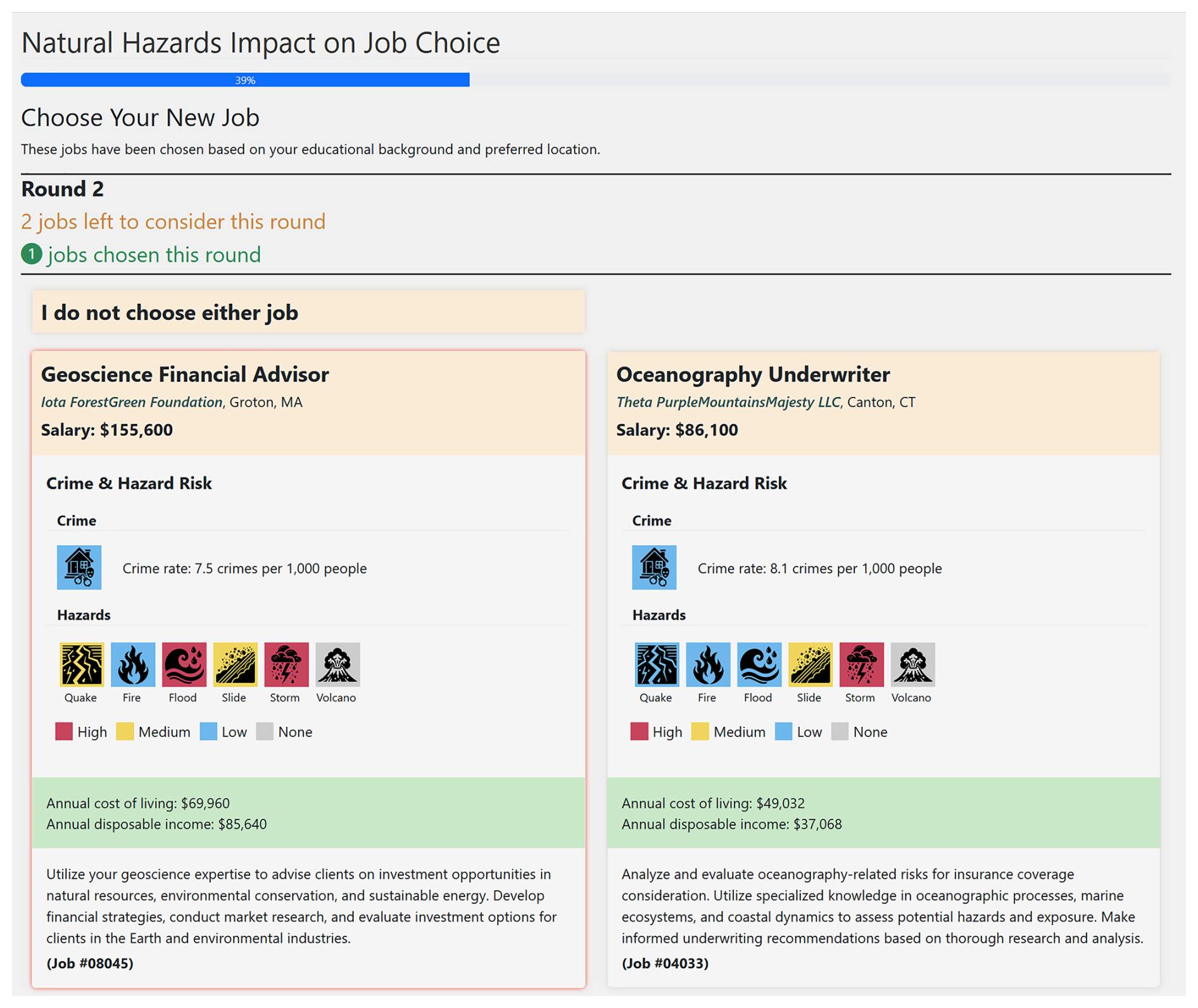 The lack of sustained engagement at the macro-level (i.e., investment, research, scholarly works, pedagogical materials) and the limited, patchy engagement at the micro-level (i.e. professional engagement in teaching, learning, research, work) suggests that the knowledge-action gap is a systemic issue across the geosciences. Beyond engagement during academic coursework, professional engagement with natural hazards is uneven across the discipline. This pattern of fragmented and incremental action also has been documented in other studies showing limited implementation of transformational adaptations to climate change impacts (USGCRP, 2023; Berrang-Ford et al., 2021; Moser and Pike, 2015). We further investigated this apparent knowledge-action gap by developing and deploying an online job-choice risk simulation that was a customized discrete choice experiment (DCE) to test how natural hazard risk, and the perception of that risk influences a person's choice of residence and occupation. Our aim with the simulation was to evaluate if geoscientists prioritized hazard risk in their decision-making more than non-geoscientists and to increase awareness among participants of how they weighed hazard risk in their personal decision-making processes.