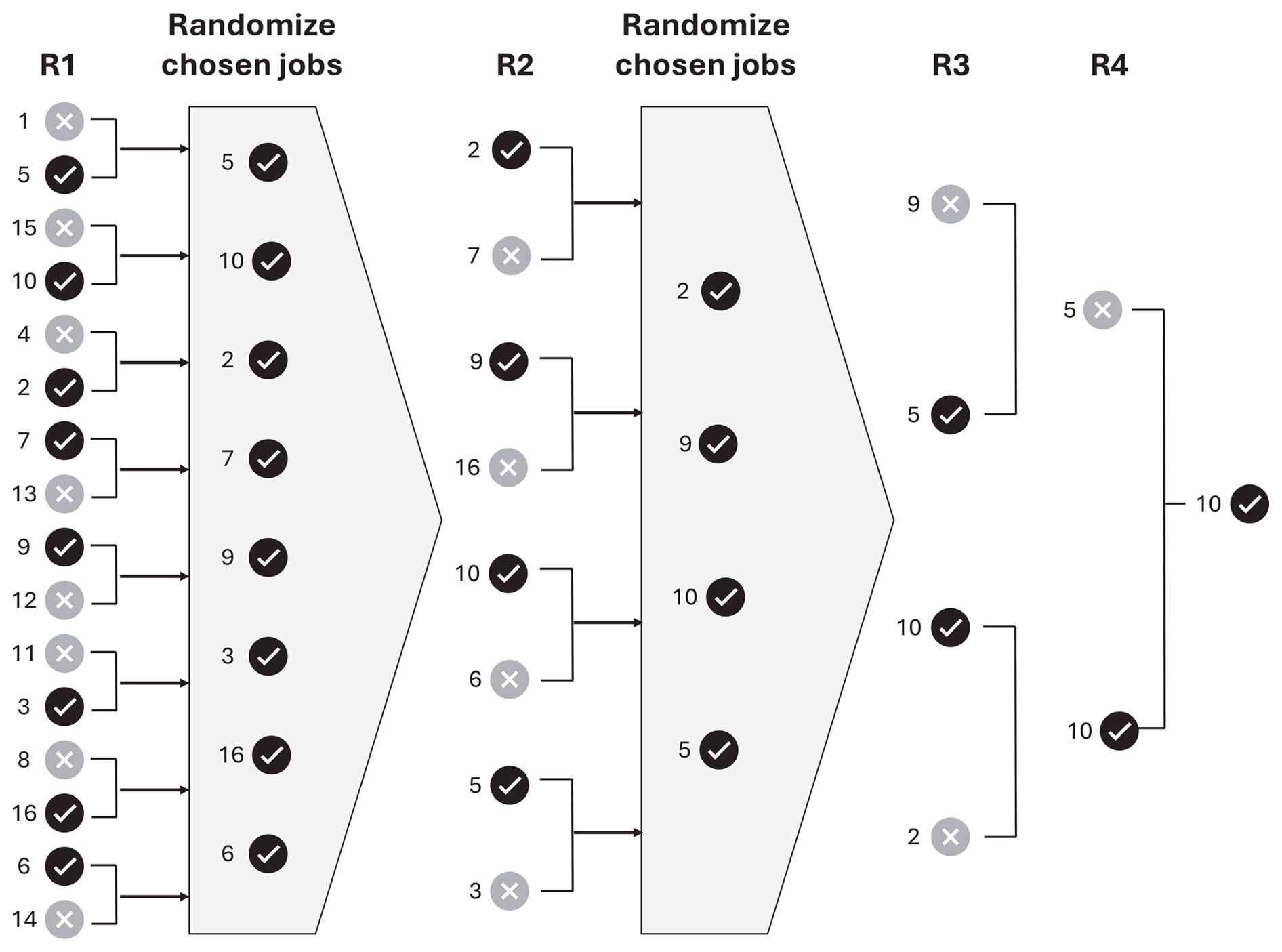 At the start of each round, the game randomized the order of the jobs in the set and then displayed a pair of jobs to the participant, prompting the participant to select either job by clicking on the job they preferred or reject both jobs. For each job offer, the following information was displayed: job title, company name and location, salary, crime and hazard risk, cost of living and disposable income, job description, and job ID (Fig. 2). In Round 1, the game displayed 8 pairs of jobs to the participant. Chosen jobs in Round 1 were randomized and displayed in pairs in the next round (Fig. 3). If there were an odd number of selected jobs, then after randomization, the first job in the set was also paired with the last job in the set for the round to have a complete set of job pairs. Job selection continued until a final job was chosen. Given this structure, final job choice could occur in Round 1, 2, or 3 depending upon the job selections made by the participant.