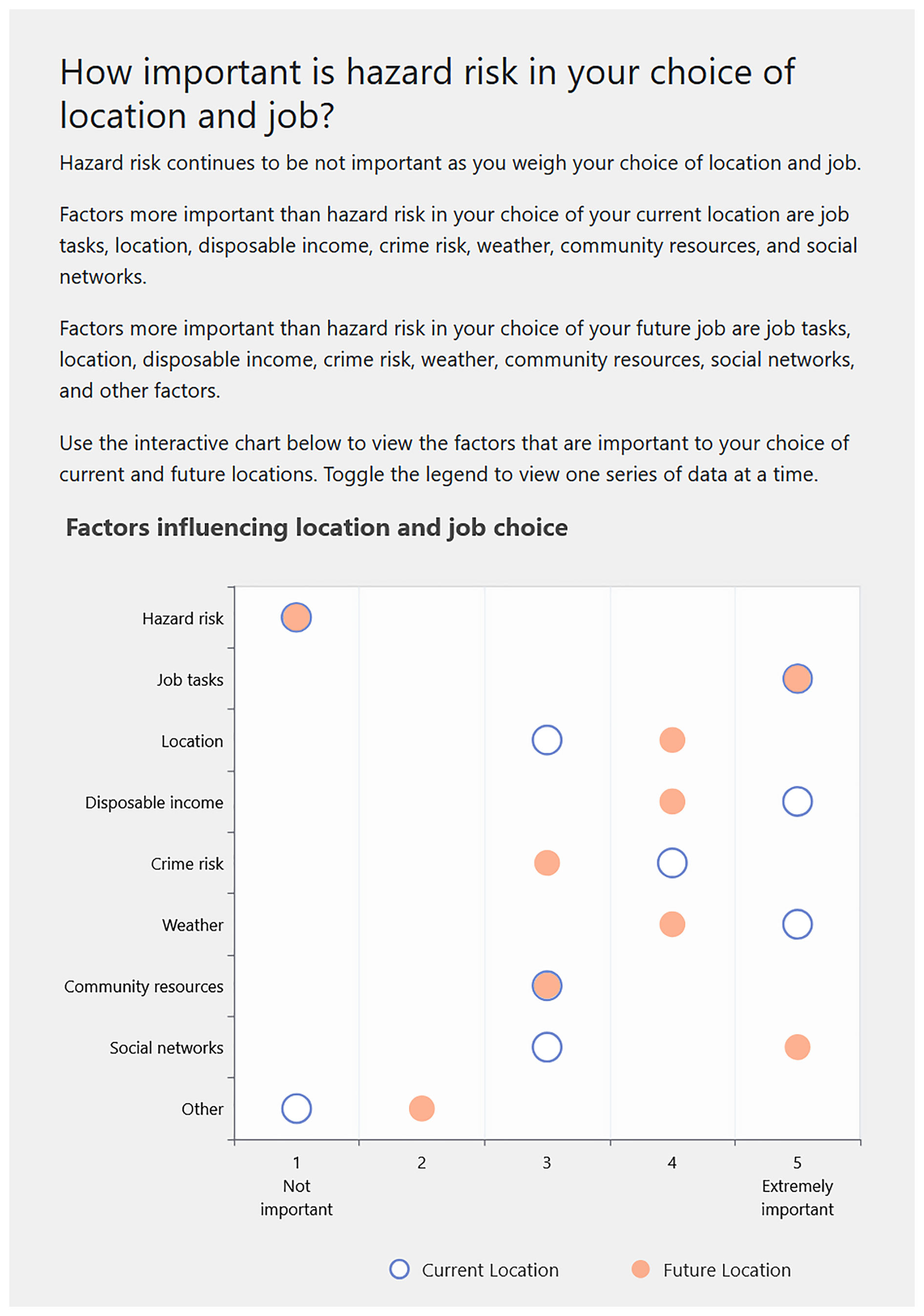 The participant also was provided information about the factors they said were important in their decision-making processes for their final job choice and their choice of current location and occupation (Fig. 5). Information was provided in textual format as well as in an interactive chart that participants could toggle between the factors influencing their decisions related to their current location and future job location. Hazard risk was displayed as the first factor to highlight it in the list of other factors of importance, such as job characteristics, location, disposable income, crime risk, weather/climate, community amenities, distance from social networks, and other factors.
