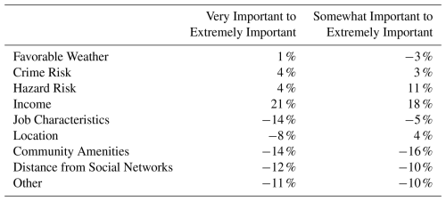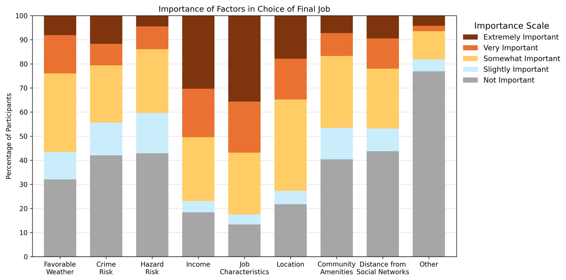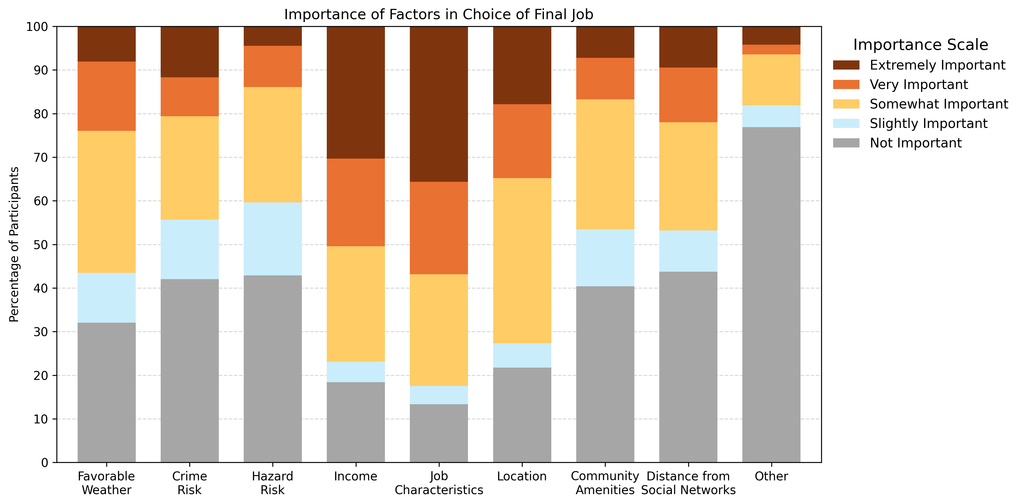 Factors important to participants in their decision-making processes related to job choice (Fig. 7) were consistent with respect to income and hazard risk, but not crime risk. Income was a strong driver for job choice and was ranked as somewhat to extremely important by 77 % of participants. Crime risk was a strong deterrent in job choice but was ranked as somewhat to extremely important by 44 % of participants. Hazard risk was marginally significant and positive at the final stage of job choice selection, suggesting that participants were willing to move into higher hazard risk areas given a high enough salary and low enough threshold for crime risk. Hazard risk was rated as not important by 43 % of participants and only slightly important by 17 % of participants.