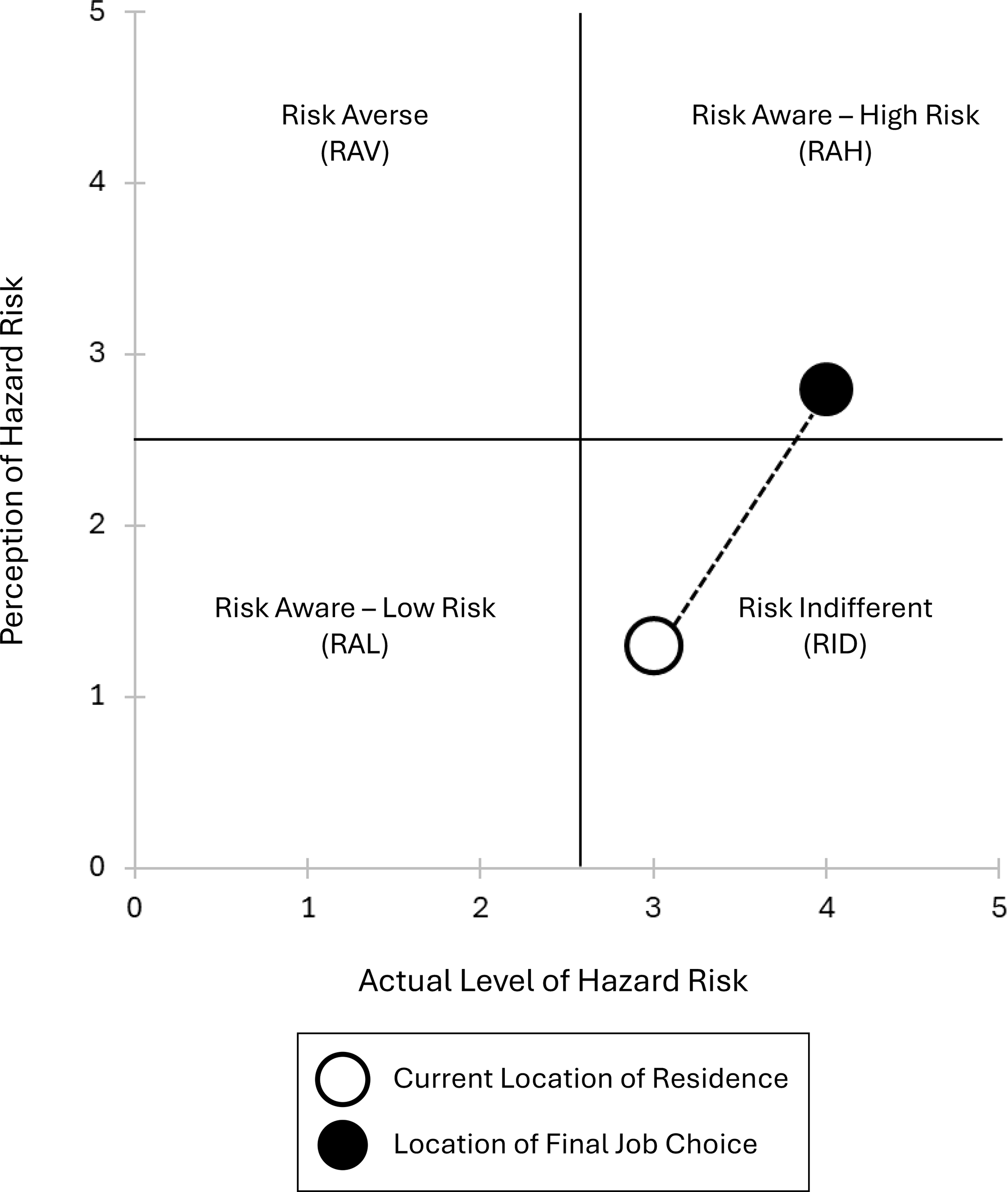 This part of the decision-making process follows the consideration that emotions and past experiences do not generally weigh heavily in the decision-making process (McNamara et al., 2024; Noll et al., 2022; Zander et al., 2020). An average of all individual hazard risk perceptions was calculated as the average risk perception. Hazard risk perception was calculated for the current location of residence and for the job location and the plotted against the actual hazard risk level for the associated location. Hazard sensitivity zones (i.e. Risk Averse, Risk Aware–Low Risk, Risk Aware–High Risk, Risk Indifferent) were determined based on quadrants from 0–2.5 and 2.5–5.0 along the risk perception and risk level axes.