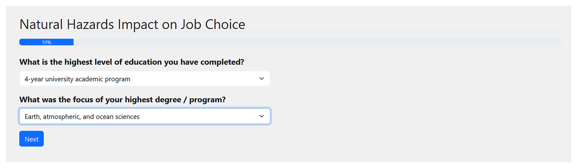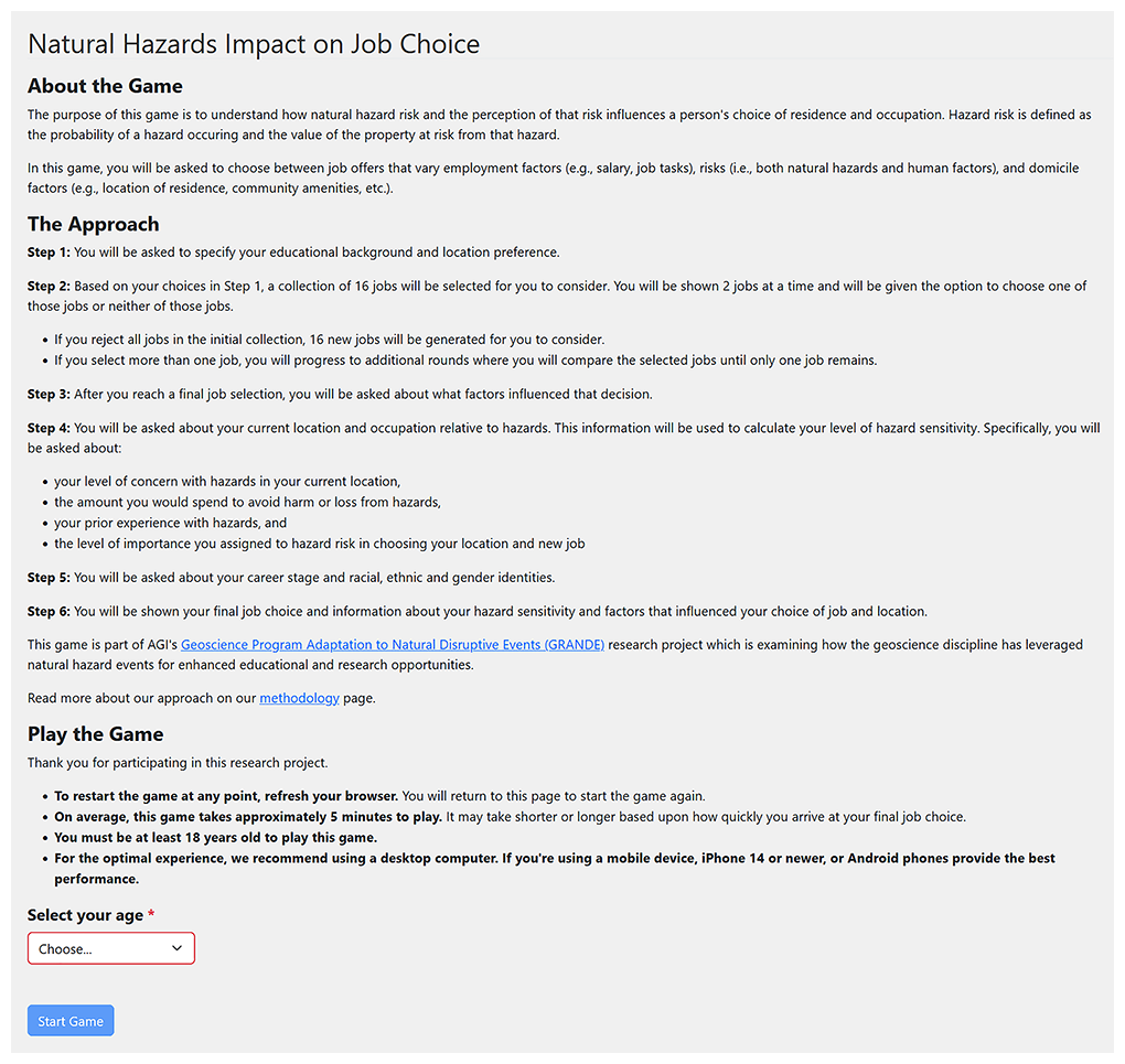 We designed the DCE as an online job-choice risk assessment simulation in which participants were asked to choose between job offers that varied employment factors (e.g., salary, job tasks), risks (i.e., both natural hazards and human factors), and domicile factors (e.g., location of residence, community amenities, etc.). The simulation was comprised of 12 short web pages (Fig. 1 and Appendix A) that guided participants through defining the parameters of their job search, conducting their job choice selection, and then through a set of reflections that allowed participants to think about their consideration of hazard risk in their personal lives. Reflection topics included questions about participants' experiences with natural hazards, and questions regarding the importance of different factors in job choice and relocation decisions. After completing the reflection questions, participants were asked to complete a set of demographic questions for cohort-based analyses. Participants were then presented with a set of results regarding their final job choice, hazard sensitivity, and factors important in their decision-making process. The software code and data requirements for the simulation is provided at https://github.com/AmericanGeosciencesInstitute/GRANDE-simulation (last access: 1 July 2025). The simulation took an average of 5 min to complete.