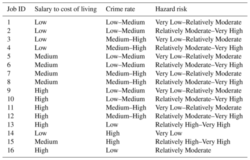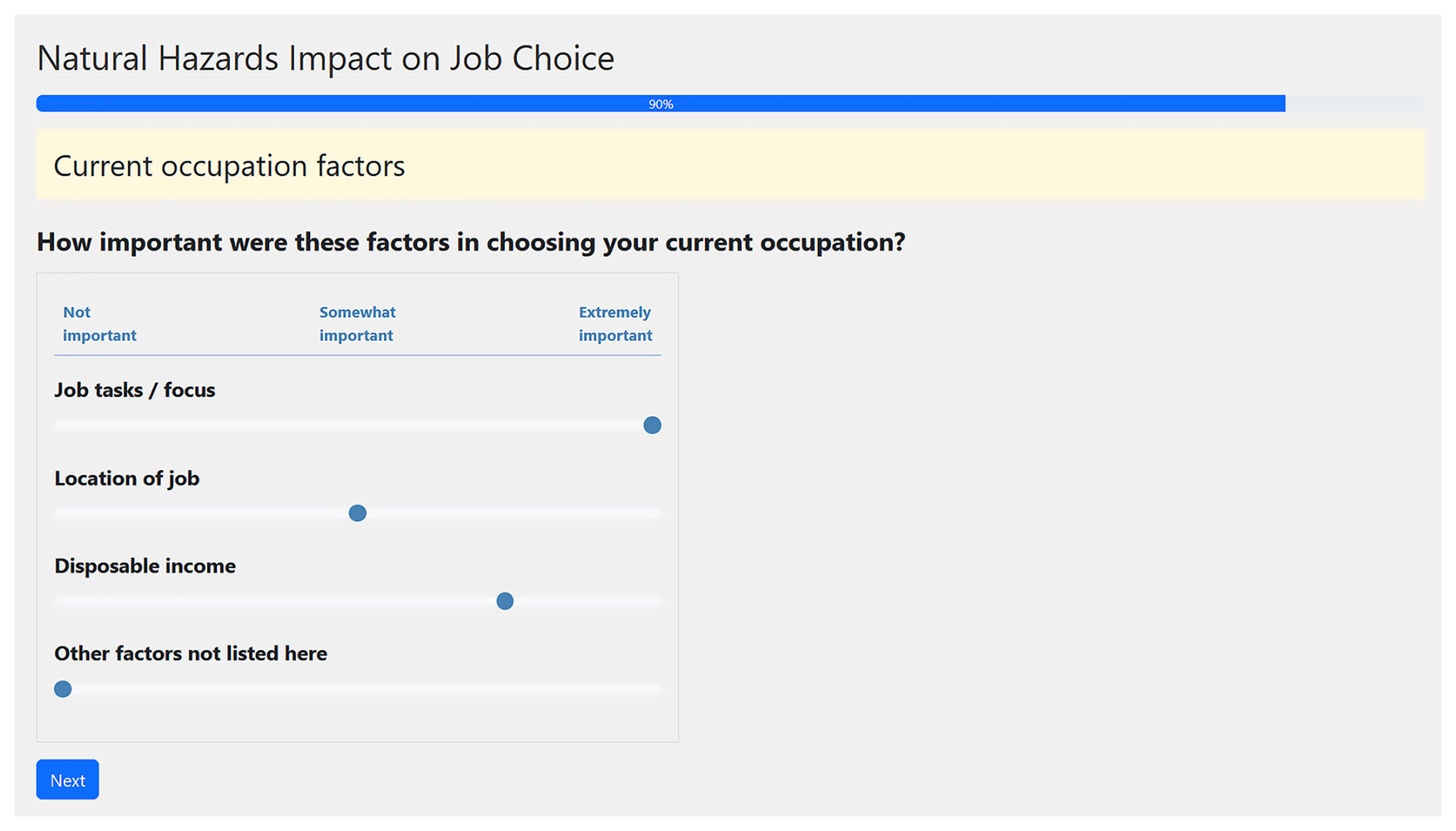 Discrete choice experiments have been used within the medical community to understand medical practitioner preferences for job characteristics; however, we were unable to identify any use of a DCE that examines job choice preferences and factors natural hazard risk into the job choice features. The study by Zander et al. (2020) is perhaps the closest analogue to our research, but their methodology is substantially different. They used a best-worst scaling stated preference method as part of an online survey to understand Australian residents' preferences for specific locations and mobility decisions. They included four environmental risks (i.e., floods, heat waves, cyclones, and wildfires) and six non-environmental factors (i.e., health care, educational opportunities, crime rate, scenery, living costs, and distance from family and friends) in their study. They found that crime risk was a strong deterrent, while cost of living and health care were strong attractors to a location (Zander et al., 2020). Environmental risks were secondary considerations in the decision-making process, and Zander et al. (2020) proposes that this may reflect a level of self-efficacy to cope with hazard impacts should they occur. In another study, Lu et al. (2018) conducted a stated preference survey among residents in Bangladesh on changing residence and job locations under flooding and cyclone impacts. Their study included demographic factors (i.e., age, education attainment, size of family, length of residence in current location, size of residential property, annual income), past experience with hazards (i.e., impacts to quality of life, recovery from impacts, relocation due to impacts), consideration of impacts in new job, and impact factors (i.e., frequency, intensity, accessibility). They found that hazard impacts and income, along with other demographic factors, such as family size and home ownership, significantly affected participants' choice in location change (Lu et al., 2015). This study contributes to the existing literature by using a DCE to assess job choice preferences among geoscientist and non-geoscientist cohorts including natural hazard risk information as part of the job offer information.