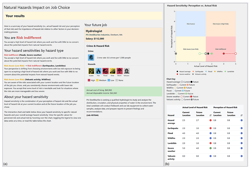 The combination of the job choice information and the reflection questions were used to generate the results provided to the participant on the final page, namely information about their hazard sensitivity, defined as the actual hazard risk of the location and their perception of that risk, as well as information about the factors they said were important in their decision-making processes. The hazard sensitivity information (Fig. 4) provided a combination of text, interactive graphics, and tabular data that discussed the change in sensitivity from the participant's current location of residence to the location of the job they chose. Hazard risk sensitivity was provided as an overall trend and for each hazard type.