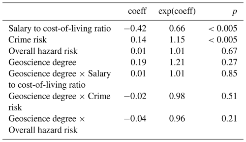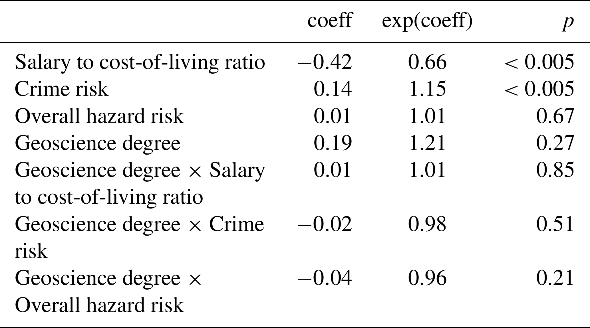 To understand which of the job features were most valued (i.e., salary-to-cost of living ratio, crime risk, overall hazard risk) from the set of 16 job offers, we ran a Cox Proportional Hazard model with interaction terms to determine if there were significant differences between the features valued by geoscientist and non-geoscientist cohorts (Table 2). Jobs with higher salary to cost-of-living ratios and lower crime risk were less likely to be eliminated across the job choice rounds. Overall hazard risk and having a geoscience degree had no effect on job option elimination. Furthermore, the interaction effects (geoscience degree × salary to cost-of-living ratio, geoscience degree × crime risk, geoscience degree × overall hazard risk) showed that geoscientists valued these job features similarly to non-geoscientists.