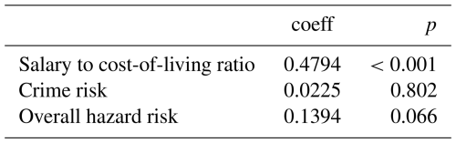 We also ran a logistic regression on the choices made during the final job pair consideration to see if the earlier patterns in job choice selection persisted into the final choice between finalist job offers (Table 3). The salary-to-cost of living ratio remained a strong and significant predictor of job choice; however, crime risk was not significant in the final choice, likely because high crime jobs had been eliminated earlier in the job choices. Hazard risk was marginally significant and positive, indicating that jobs with higher overall hazard risk were more likely to be chosen from the final pair. We also ran the logistic regression with the same geoscience interaction terms as in the Cox proportional hazard model. This caused all terms to become insignificant except for the salary to cost-of-living ratio and indicate that geoscientists did not behave differently from non-geoscientists on their final job choice selection.