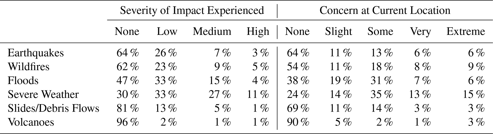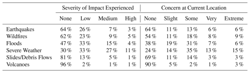 Table 8Concern-impact index. Negative values indicate that impact severity from a hazard was higher than concern for the hazard at the participant's current location of residence. Positive values indicate that concern for the hazard was higher than the level of impacts experienced. Neutral values indicate that the concern was in alignment with the level of impacts experienced.
