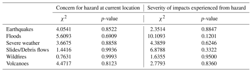When reflecting on the severity of impacts experienced from different hazards, most participants reported either no impacts or low severity impacts from hazards (Table 6). Among hazards, participants reported experiencing higher severity impacts from severe weather and floods, with 38 % reporting medium to high severity impacts from severe weather and 19 % reporting the same level of impacts from floods. Furthermore, severe weather and floods were also the two hazards where participants expressed the most concern. A Chi-squared test yielded no statistically significant differences between the responses from the geoscientist, non-geoscientist and whole population cohorts (Table 7).