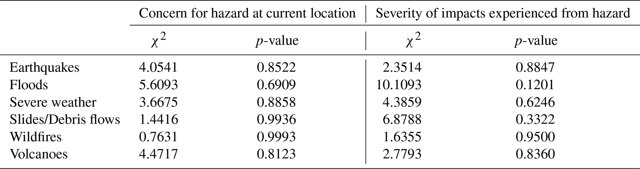 Table 7χ2 test of significance between all participants, geoscientists and non-geoscientists for concern for hazards and experience with hazard impacts.