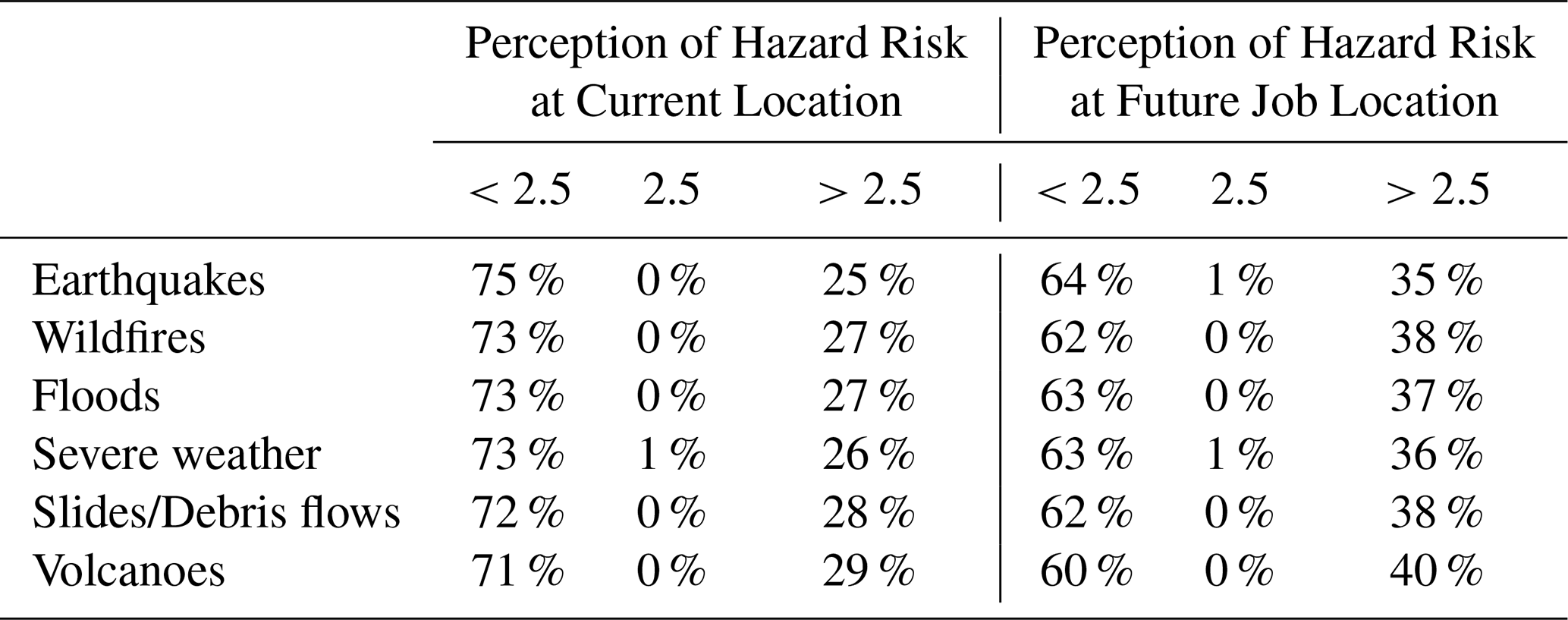 Hazard risk perception was calculated as a combination of the concern-impact index and the actual hazard risk level for the hazard at a given location (Table 9). For each location (i.e., current location of residence and final job location), the hazard risk perception was plotted against the actual risk for each specific hazard. Hazard risk sensitivity zones (i.e. Risk Averse, Risk Aware–Low Risk, Risk Aware–High Risk, Risk Indifferent) were determined based on quadrants from 0–2.5 and 2.5–5.0 along the risk perception and risk level axes (Fig. 8). Risk perception was strongly driven by the level of importance assigned to hazard risk in the decision-making process given the 0.85 weight assigned to this factor in the in Eq. (2). Since most participants rated hazard risk as not important or slightly important, hazard risk perception was generally low among participants for both their current location and at the location of their future job. This outcome resulted in most hazard sensitivities varying between the Risk Aware–Low Risk and Risk Indifferent zones depending upon the actual hazard risk level of the location. Interestingly, perception of hazard risk was higher for the final job choice than for the current location of residence. This suggests that while hazard risk may not have previously been part of the decision-making process, some participants did place a higher importance on it when considering their future jobs.