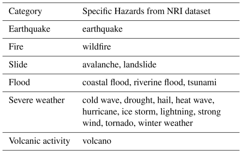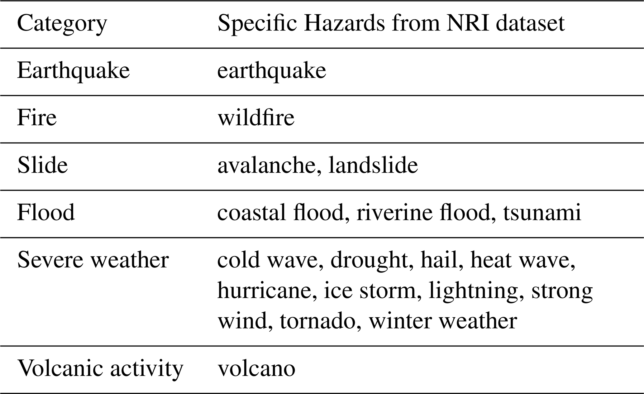 We used the National Risk Index (NRI) data to map natural hazard risk index values to the county level for each state. We included the overall hazard risk value for the county and then mapped the following six hazard categories to specific hazards from the NRI dataset. For our individual hazard category values, we selected the highest hazard risk rating for all specific NRI hazards in that category.